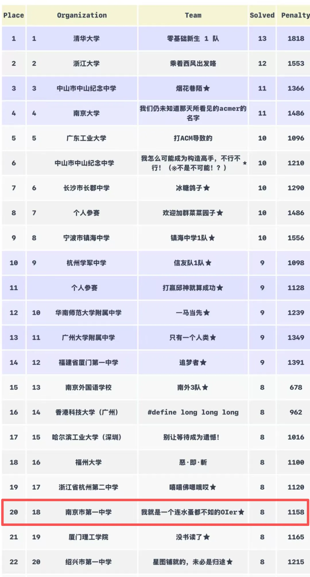 本次大赛共有326支队伍,来自全国202所高校参赛,另外有包括我校在内的25所中学受邀,共977人同台竞技,获得冠亚季军的分别是来自清华大学、浙江大学、南京大学的队伍。南京一中代表队表现亮眼,排位第20名超越金牌线,成绩优异!