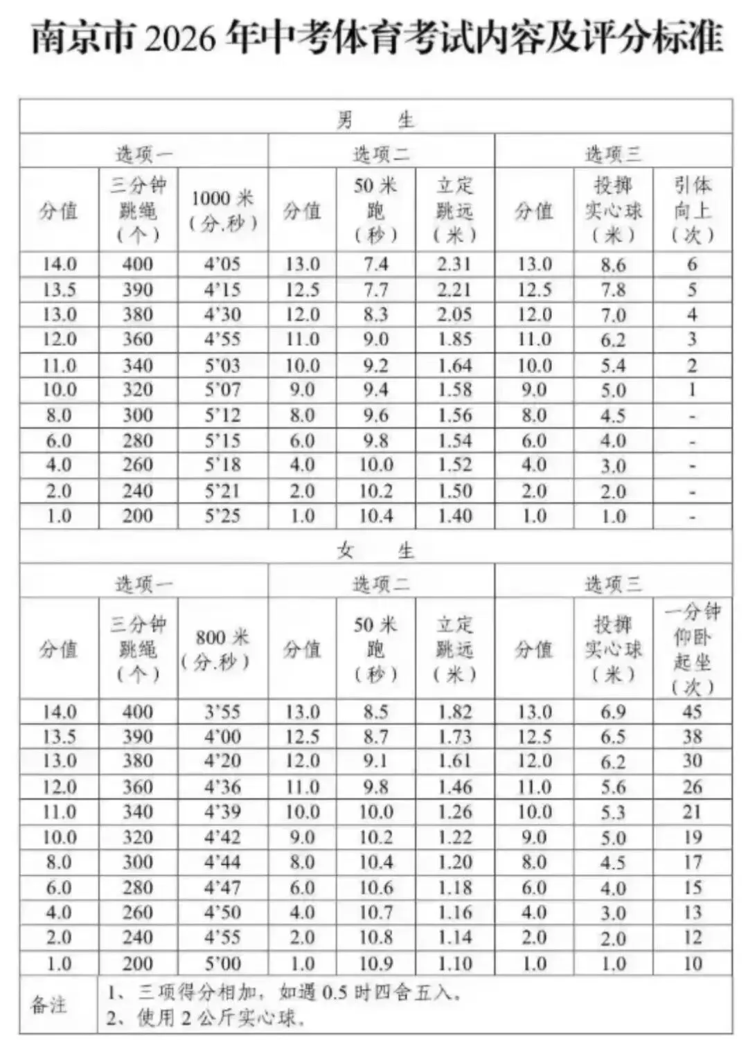 南京市中考体育考试采取选项办法,考生在三类选项中各选择一个项目测试,三项满分为40分,计入升学总分。