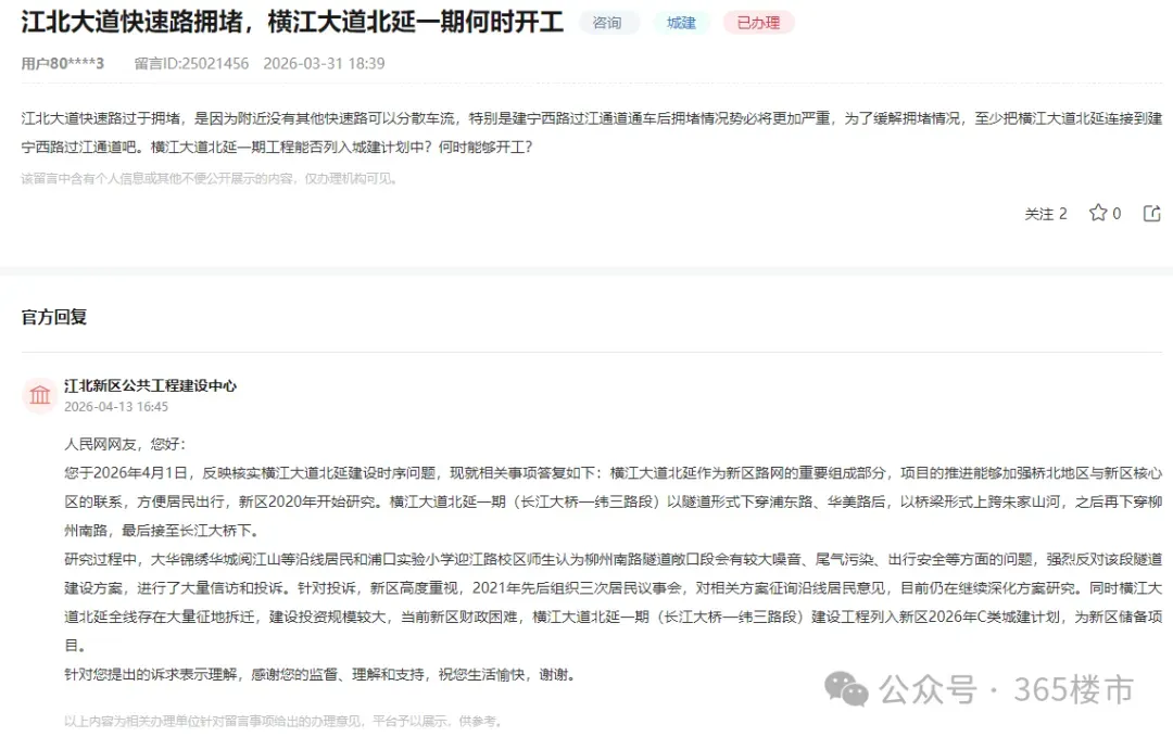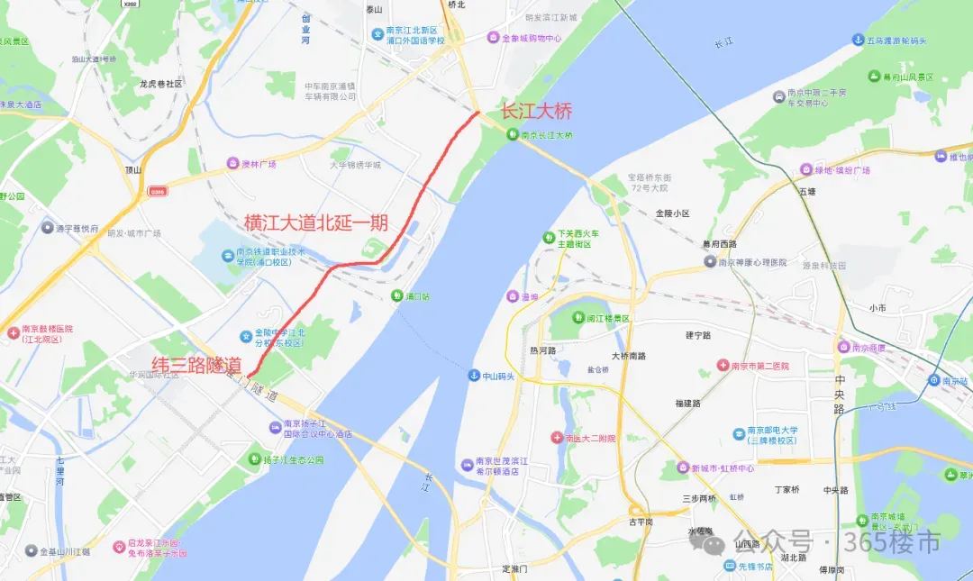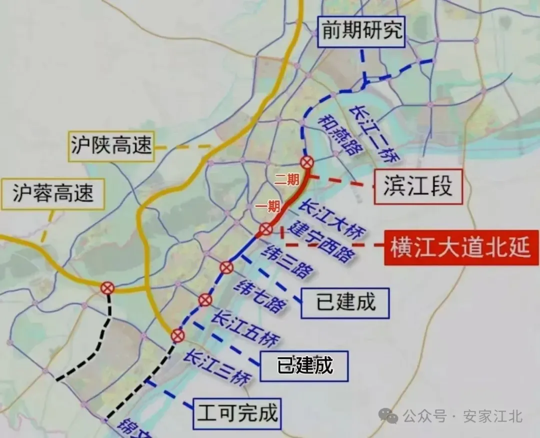该条通道是贯穿江北直管区的第二条快速路,该项目全段建成后将串联起桥北、老浦口、江核、五桥片区,促进江北一体化发展。同时该快速路将串联燕子矶长江隧道、长江大桥、建宁路长江隧道、扬子江隧道、江心洲长江大桥,提升江北过江通勤效率,缓解江北大道快速路拥堵情况。就在今天,我在政府官网发现,有网友对横江大道北延建设情况进行问政:江北大道快速路过于拥堵,是因为附近没有其他快速路可以分散车流,特别是建宁西路过江通道通车后拥堵情况势必将更加严重,为了缓解拥堵情况,至少把横江大道北延连接到建宁西路过江通道吧。横江大道北延一期工程能否列入城建计划中?何时能够开工?随后官方回复:横江大道北延一期(长江大桥—纬三路段)研究过程中,大华锦绣华城阅江山等沿线居民和浦口实验小学迎江路校区师生认为柳州南路隧道敞口段会有较大噪音、尾气污染、出行安全等方面的问题,强烈反对该段隧道建设方案,进行了大量信访和投诉。针对投诉,新区高度重视,2021年先后组织三次居民议事会,对相关方案征询沿线居民意见,目前仍在继续深化方案研究。同时横江大道北延全线存在大量征地拆迁,建设投资规模较大,当前新区财政困难,横江大道北延一期(长江大桥—纬三路段)建设工程列入新区2026年C类城建计划,为新区储备项目。正如网友所说,现如今的江北大道越发拥堵,尤其是在江北大道国际健康城段进行改造之后。早上8点多的江北大道,从朱家山河处一直堵到国际健康城段,拥堵长度超过了5公里。直到早上九点多,拥堵情况才有所好转,不过仍然有1公里多车辆缓行。不少都是从桥北、高新区域前往江核,亦或是通过江北大道快速路前往各个过江通道的车辆。而从官方回复内容来看,原计划横江大道北延一期(长江大桥—纬三路段)以隧道形式下穿浦东路、华美路后,以桥梁形式上跨朱家山河,之后再下穿柳州南路,最后接至长江大桥下。其一:由于建设方案受到如大华锦绣华城阅江山等沿线居民的强烈反对。对相关方案征询沿线居民意见,目前仍在继续深化方案研究。其二:横江大道北延全线存在大量征地拆迁,建设投资规模较大,当前新区财政困难。不过,好在该项目被列为2026年C类城建计划,为新区储备项目。从航拍图中可以发现,该片区的拆迁工程的确是海量的,对于资金要求极高。从目前情况来看,横江大道北延工程近期启动的可能性并不大,桥北区域居民出行前往江核,还是主要依靠江北大道快速路。