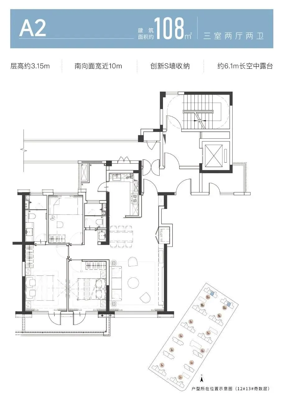 建面约108㎡户型:三室两厅两卫,层高约3.15米,南向面宽近10米,做了创新S墙、长度约6.1米空中露台。