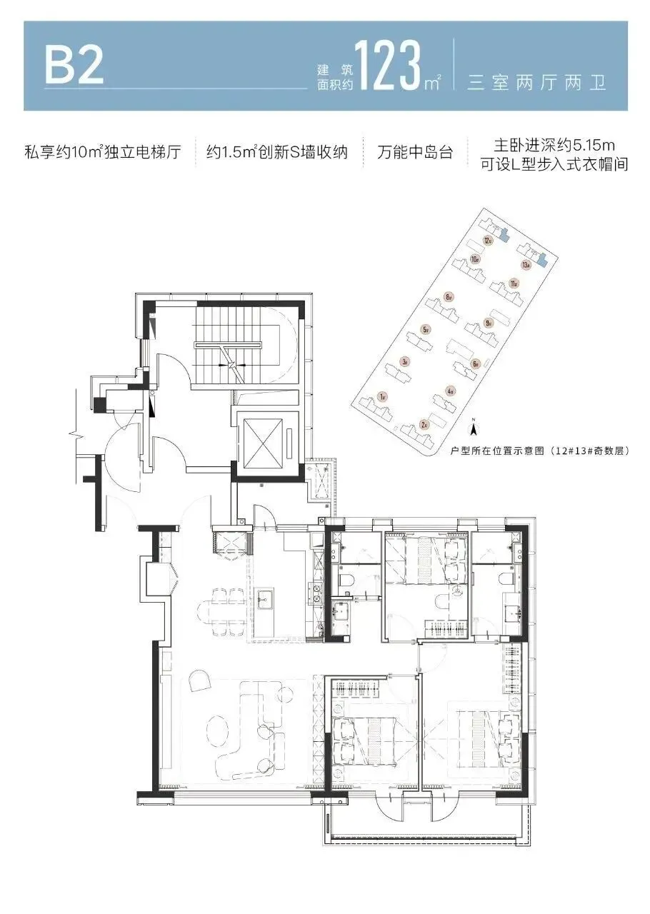 其中B2户型私享约10㎡独立电梯厅,约1.5㎡创新S墙收纳,主卧进深约5.15米,可设L型步入式衣帽间。