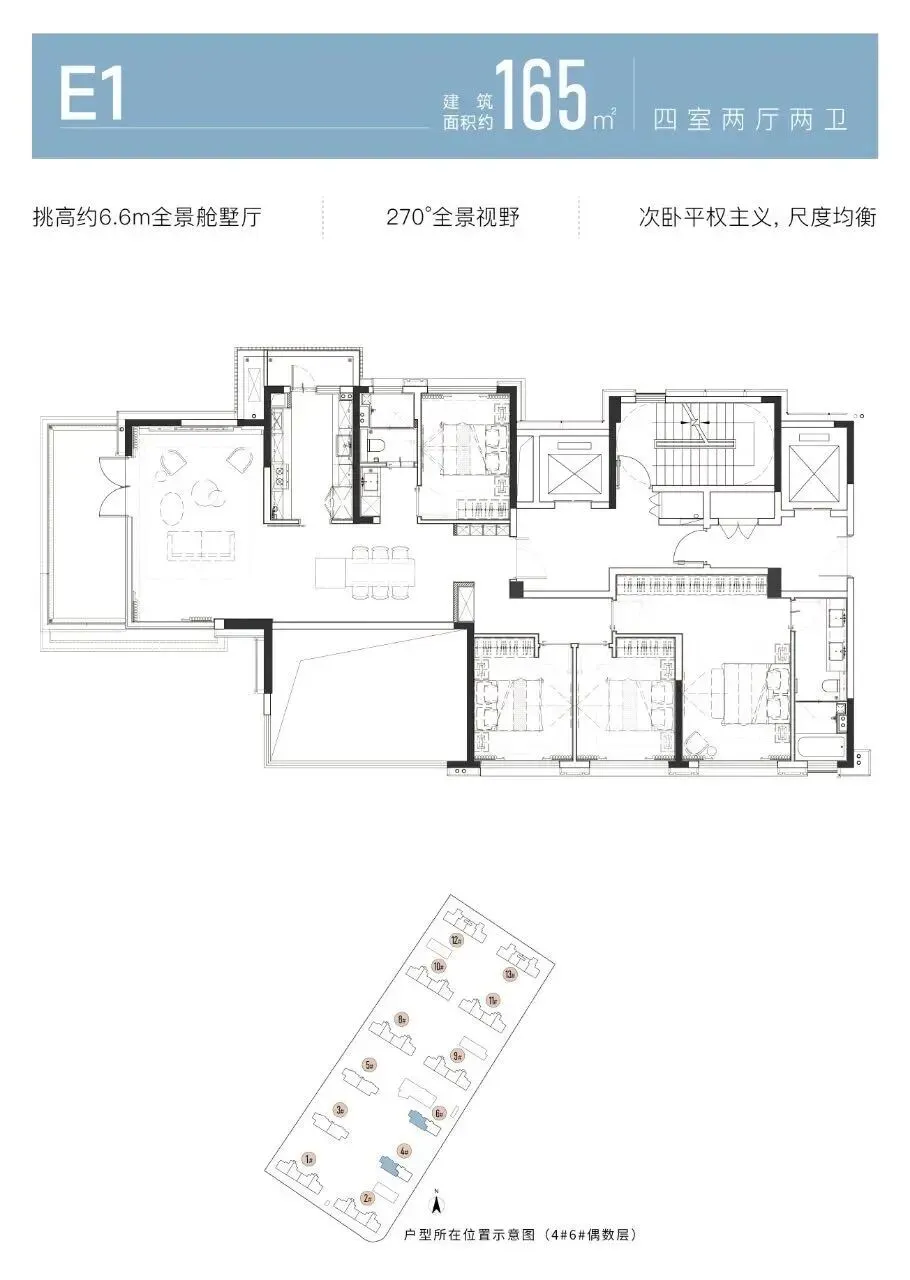 建面约165㎡旗舰户型:位于小区正中央仅4栋楼,打造约6.6m全景舱墅厅,享270°全景视野,奢享次卧平权主义。