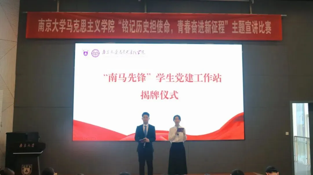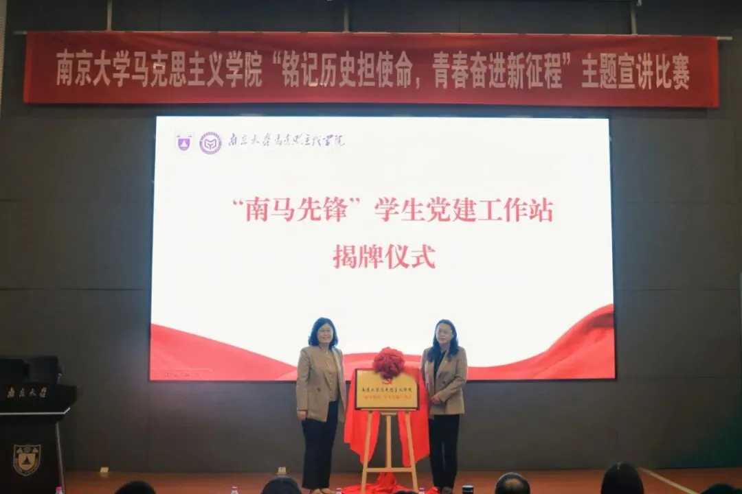 活动伊始,在现场师生代表的共同见证下,南京大学党委学工部副部长李宁老师、马克思主义学院党委书记时昱老师共同为“南马先锋”学生党建工作站揭牌。“南马先锋”学生党建工作站将着力构建“理论学习有深度、组织建设有力度、作用发挥有温度”的党建工作阵地,力争成为学生党员骨干锤炼党性、砥砺初心的重要阵地和精神家园。