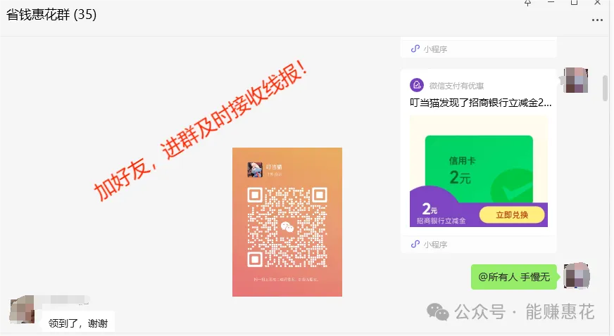 扫下面的二维码加我拉你。(群内禁止一切广告、推广、链接、助力、人头、返利、机器推销等,发现直接自动踢且永久拉黑,另外请勿重复加群,系统会自动踢出重复加群的人)请添加好友,拉你进群获得最新线报!还有办信用卡额外返现福利!(星标置顶微信公众号:能赚惠花)!