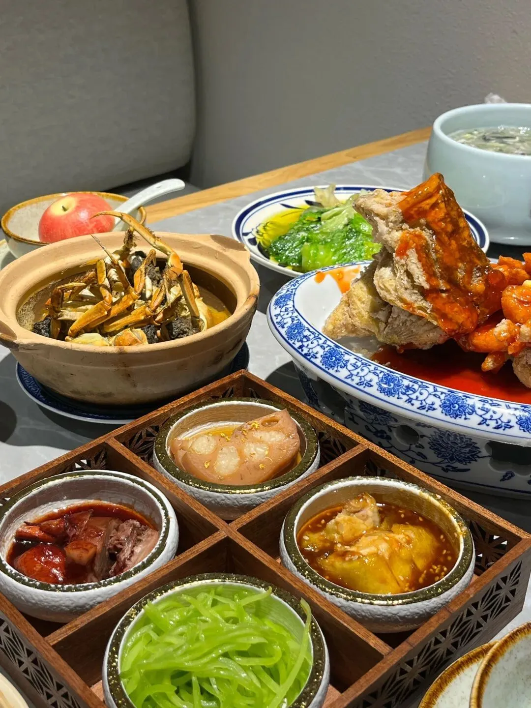 江南四味格碟:一道经典冷盘前菜,也可以理解为一道精致的“开胃拼盘”,通常是一个被分隔成四格的精致大盘。