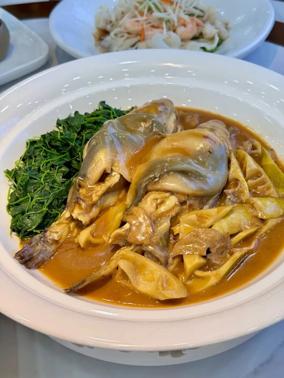 秧草红烧菊黄豚:堪称春季时令菜中的“顶流”,尤其在你所在的江苏地区,是极具代表性的珍馐美味。它将“长江三鲜”之一的河豚与清香的秧草巧妙结合,成就了“食河豚而百鲜无味”的极致体验。