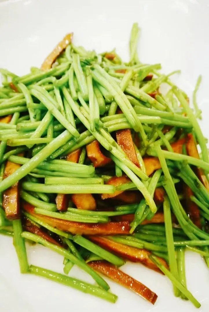 泉水浸菊叶配芦蒿香干:泉水浸菊叶指的是菊花脑(也叫菊花叶)。在南京,人们习惯用清冽的泉水或好水来焯烫或凉拌这种带有独特清凉香气的绿叶菜。它自带一种“降火”的清凉感,非常爽口。配芦蒿香干是经典的南京“旱八鲜”组合。芦蒿有着特殊的清香,口感脆嫩;香干(豆腐干)则提供了豆香和咸鲜的底味。通常芦蒿炒香干是热菜,但在这里,可能是指将芦蒿焯水后凉拌,或者取其清香之意与菊叶搭配。