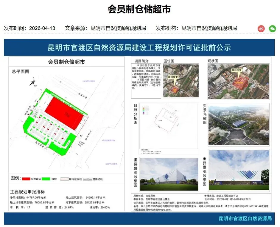 4月13日,昆明市自规局发布项目过规公示,标志着昆明山姆会员店即将全面开工建设。
