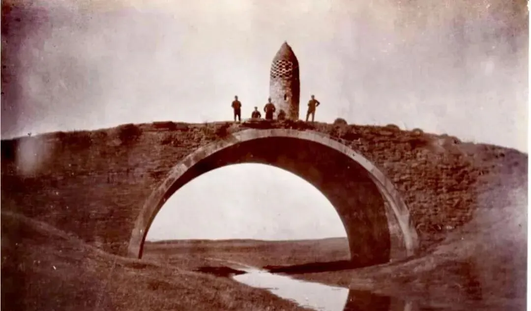 图里这座拱形石桥,桥心生生立着一根高高的蜂巢尖塔,形状怪得很,看着像谁把棋子丢到了桥顶上,旁边几个人站着,也没个牌子写说明,这古塔到底干啥用,谁来头也闹不明白,史料里没留,只能瞪眼猜