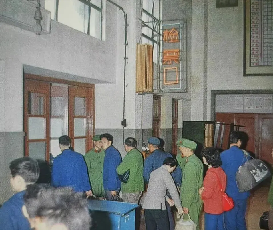 再看大家手里拿的东西,也很真实。有人拎布包,有人提网兜,有人肩上扛着大包。尤其右边那个鼓鼓囊囊的行李袋,一看就不是现在那种标准化行李箱,它更像家里装出来的——能塞就塞,结实耐用,装的是一路上的全部家当。那会儿出趟远门,带的东西往往都实在,吃的、穿的、路上要用的,能想到的都想带上。