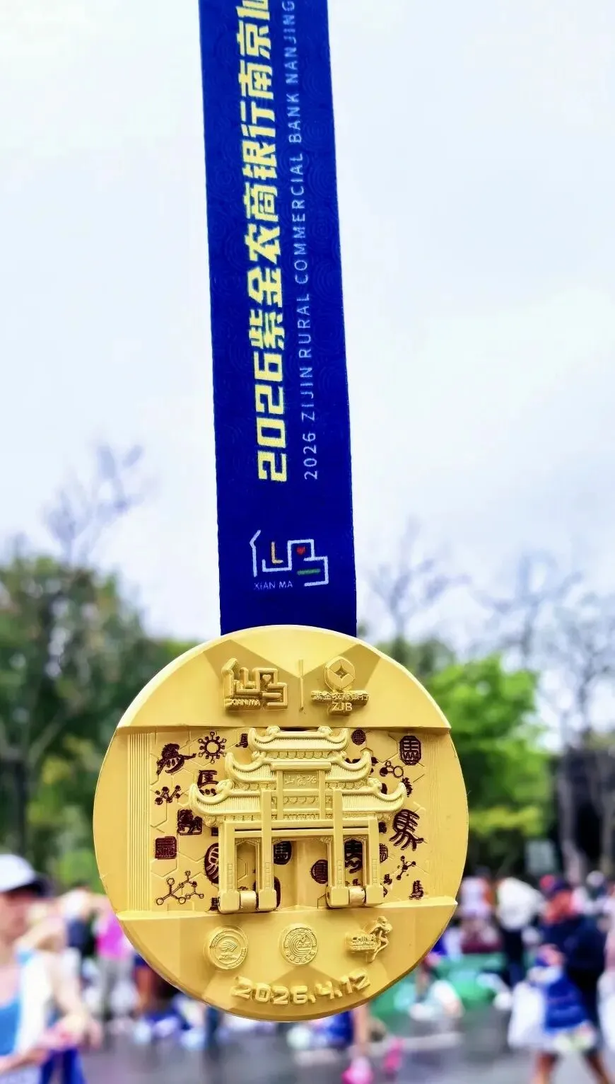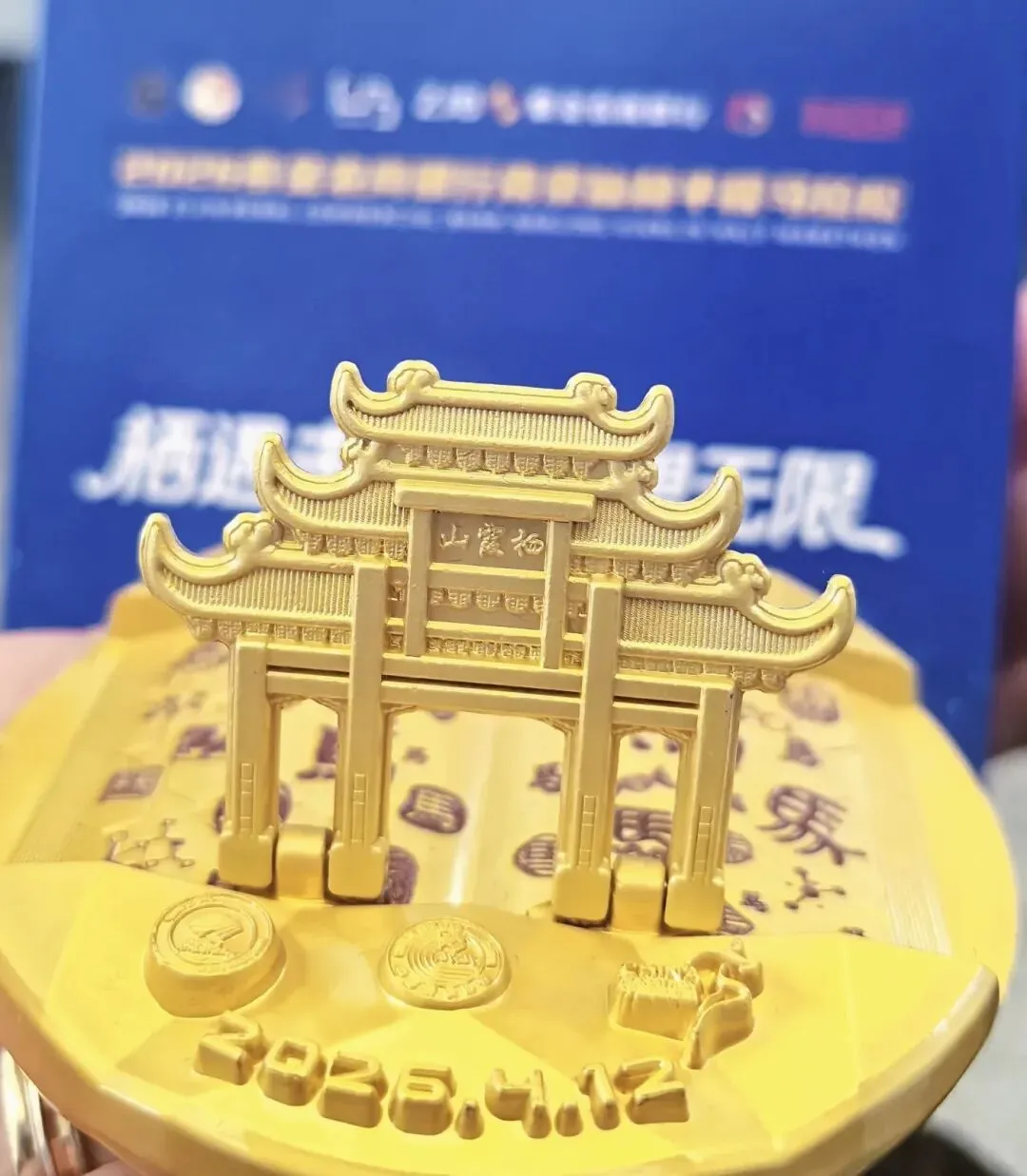 本届南京仙林半程马拉松奖牌,从正面来看,是精雕栖霞山门,凭山门远眺。底纹则是融绘马年祥瑞。