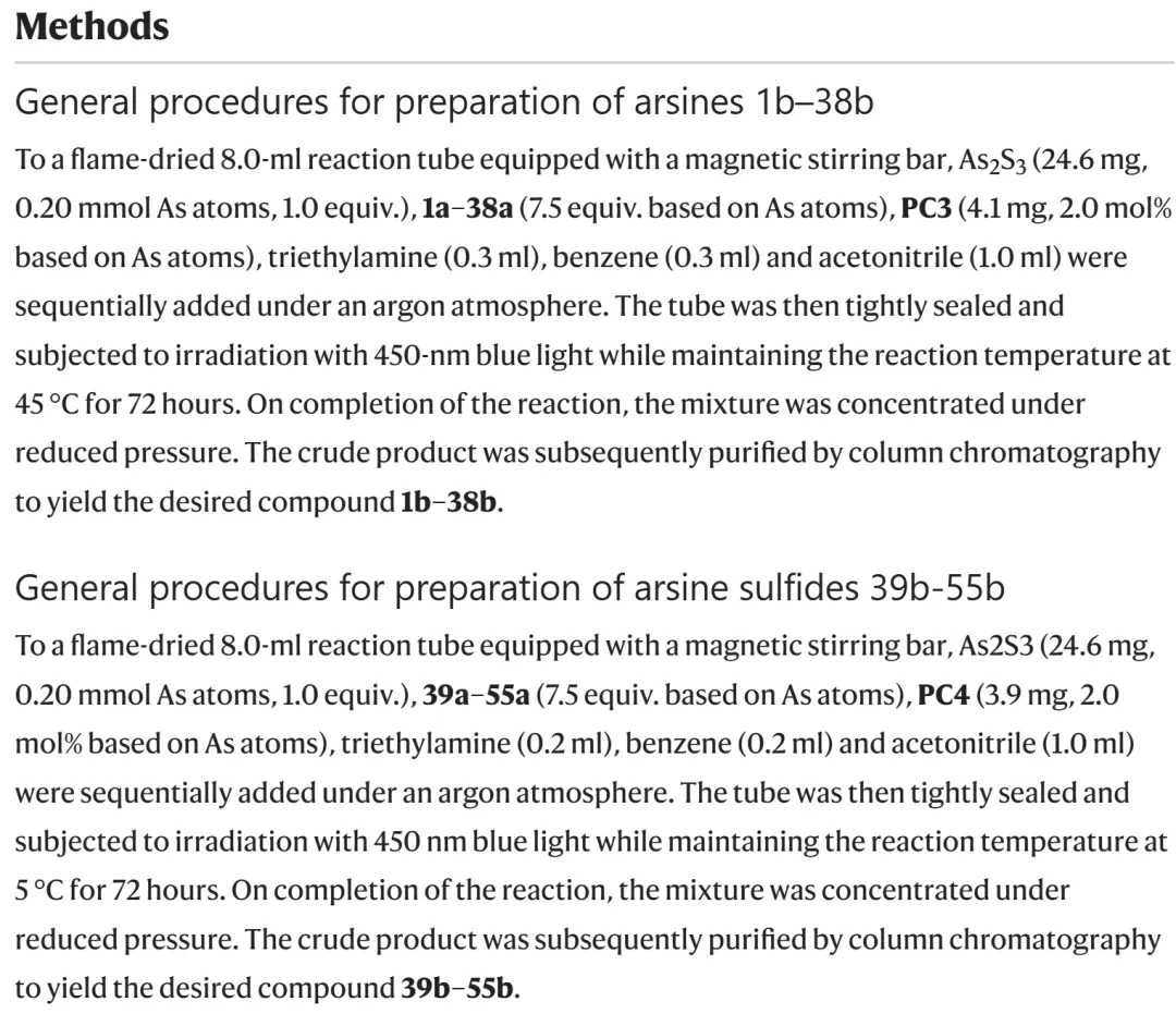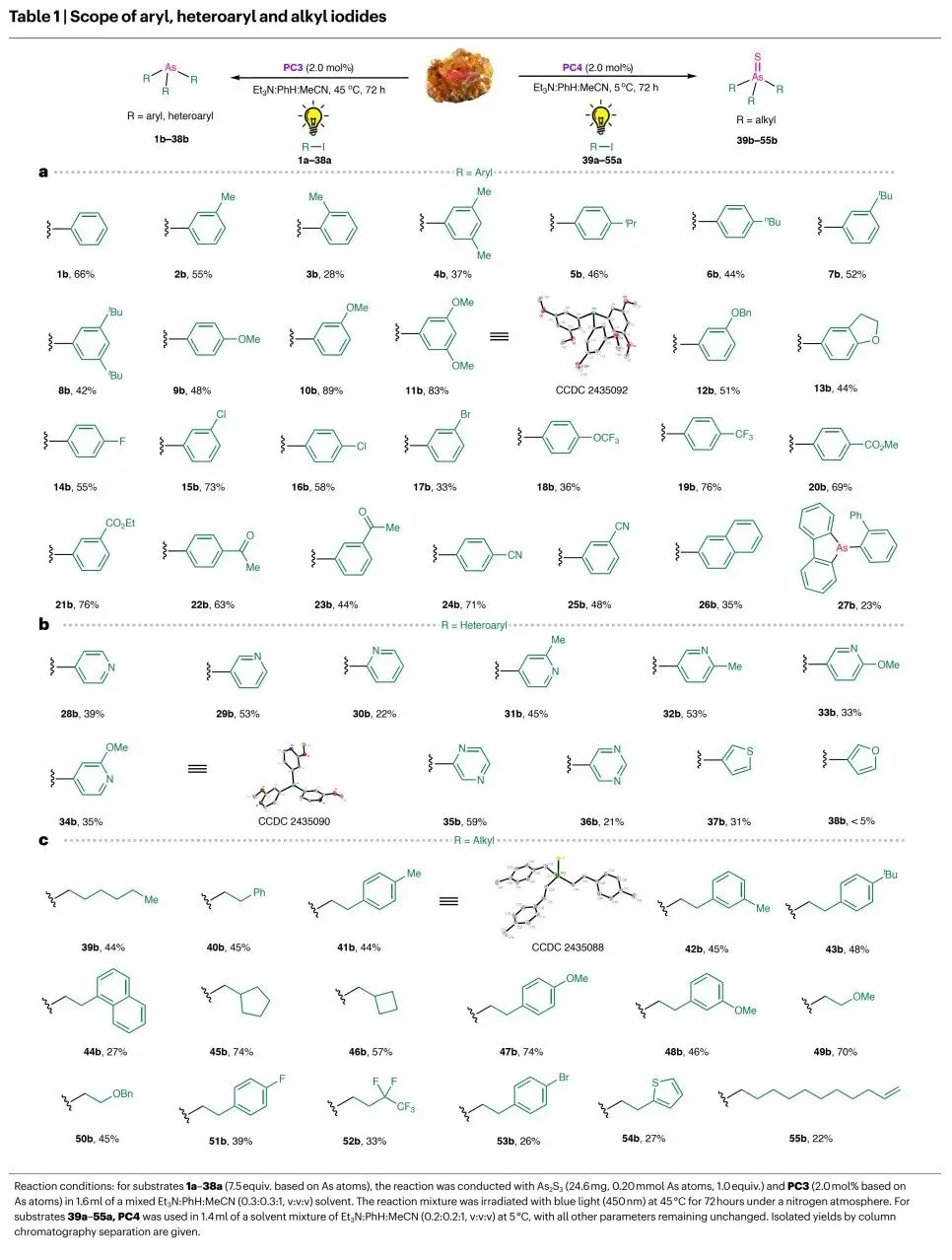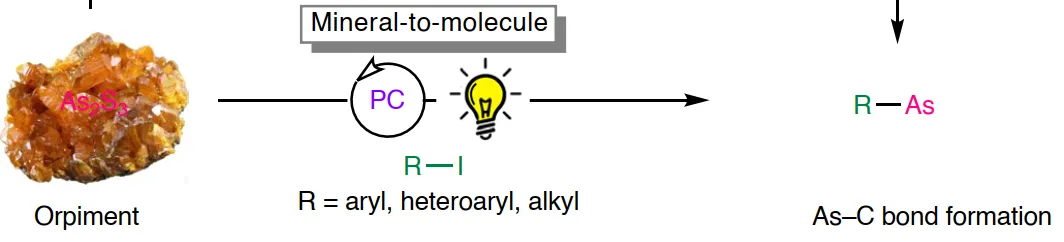 史壮志等人利用可见光光催化,此提出一种“矿物到分子”的方法,用于从硫化物矿物直接合成有机砷化合物。通过使用易于获取的铱基光催化剂与叔胺相结合,雌黄能够将砷原子转移给多种芳基和杂芳基碘化物,以高选择性和高效率形成有机胂。该方法也适用于使用烷基碘化物生产有机胂硫化物。直接使用天然存在的矿物有望建立起更安全、更可持续的砷化学框架,并可能在整个科学领域中开启新的应用。