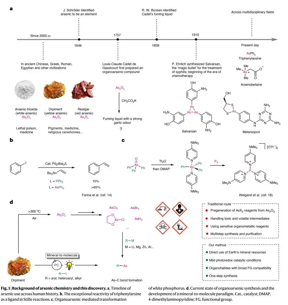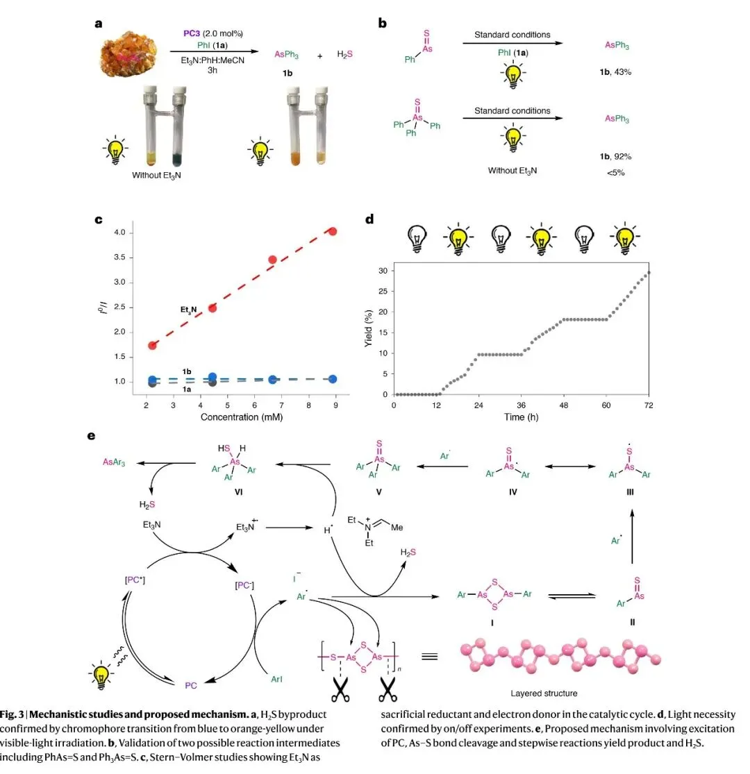 通过一系列实验揭示了光催化从雌黄合成有机砷化合物的反应机理:图片来源:Nature Chemistry