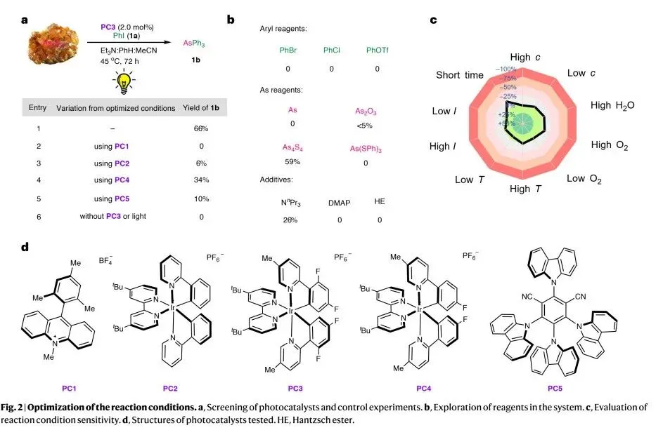 优选条件:以雌黄(As₂S₃,需研磨成粉)和碘苯为底物,使用特定的铱基光催化剂 PC3 和添加剂 三乙胺,在蓝光照射、45°C下反应。