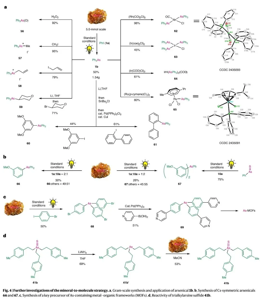 史壮志与研究者利用光氧化还原催化,直接从硫化物矿物(如雌黄)合成有机砷化合物。完全避免了有毒的含砷中间体。可在温和条件下一步构建多种类型的有机胂(芳基、杂芳基、烷基)。所有原料均可商业获得,易于放大生产。该“矿物到分子”的范式在地球化学与合成化学之间建立了桥梁,为未来可持续、环境友好地利用元素提供了战略蓝图。