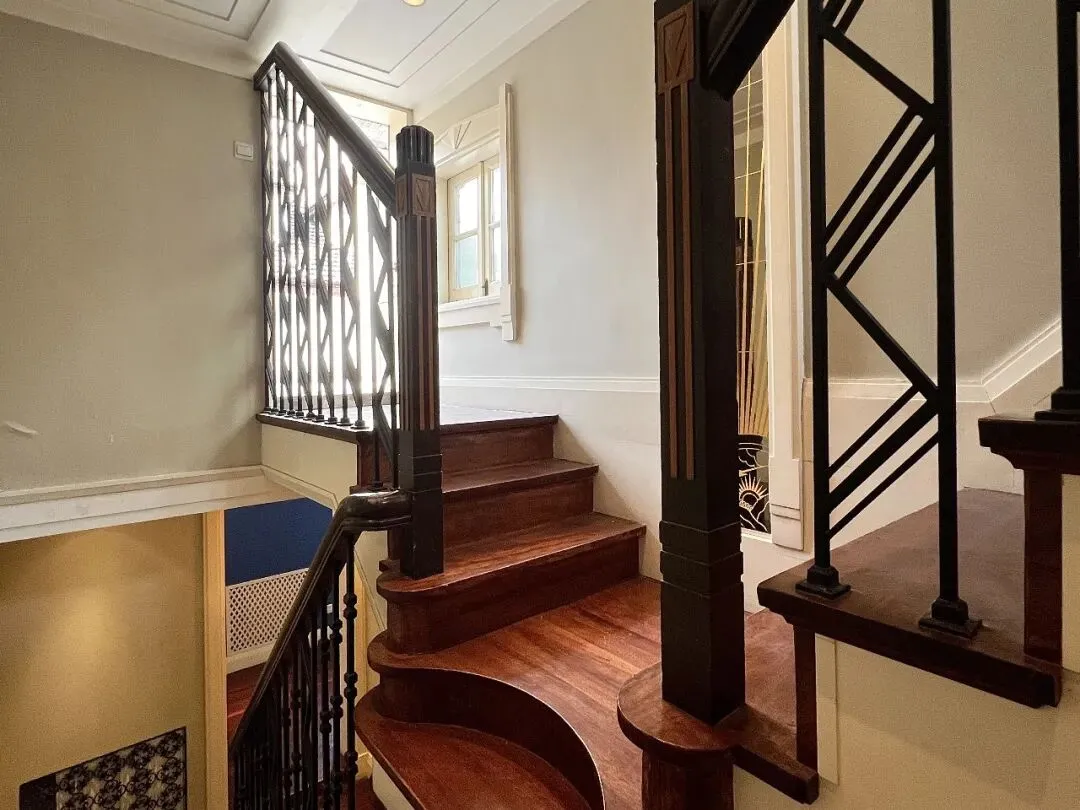 【楼道】原始木质楼梯踏步平缓,修旧如旧的工艺还原老建筑肌理,东侧双开窗引入充足自然光。