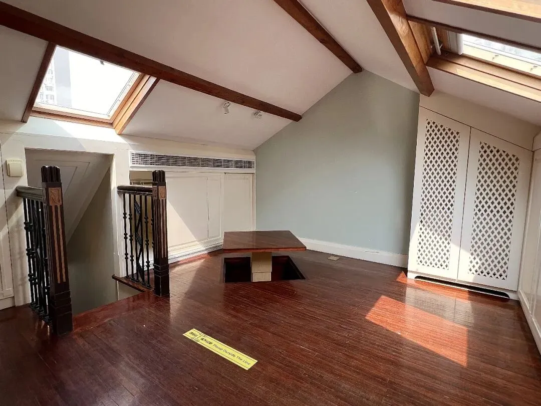 【假四层】尖顶空间设计巧妙,南北三扇天窗引入自然光,整排柜子提供超强收纳;升降式台面可喝茶会客,放下可变客卧,实现一空间多用途。