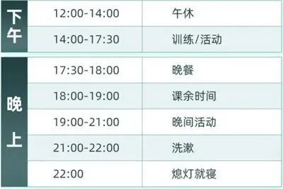 9后勤保障 用餐标准四菜(两荤两素)+1汤+2主食+水果(少数民族单独配餐); 住宿标准准营房6-10人间,军用四件套、独立卫浴空调等; 交通保障正规协议旅游车辆公司大巴和驾龄10年以上经验丰富的老司机驾车; 医护保障营期内赠送有30万意外伤害险,营地内设置24小时医务室,配备有应急军事医疗设备及经验丰富的队医; 携带物品清单1、洗漱用品:牙杯、牙刷、牙膏、毛巾、洗发液、沐浴液、浴巾2、生活用品:换洗衣服2套、内衣3套/运动鞋2双/袜子3双,拖鞋1双3、学习用品:课外书籍1-2本、暑假作业等(可根据自身情况携带) 我们组织此项活动的十七余年经验,在活动的每个环节上都能够及时加强安全预防和保障措施,以往夏冬令营做到零安全事故,家长可以达到97%满意度。多年来,我们一直怀揣着热忱的态度和专注的精神!以确保所有活动万无一失!