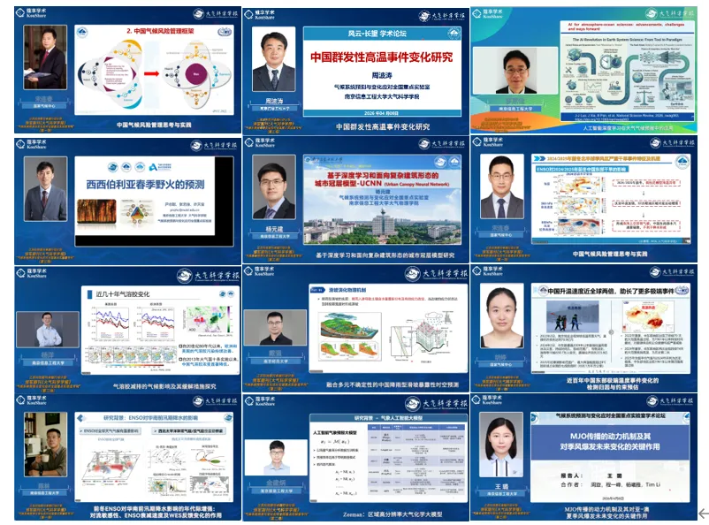 论坛上,国家气候中心宋连春研究员、胡婷研究员,南京师范大学戴强教授,以及南京信息工程大学周波涛教授、罗京佳教授、尹志聪教授、杨元建教授、孙博教授、杨洋教授、陈林教授、金建炳教授、王璐教授共12位专家,依次围绕“中国气候风险管理思考与实践”“近百年中国东部极端温度事件变化的检测归因与约束预估”“融合多元不确定性的中国降雨型滑坡暴露性时空预测”“中国群发性高温事件变化研究”“人工智能深度学习在天气气候预报中的应用”“西西伯利亚春季野火的预测”“基于深度学习和面向复杂建筑形态的城市冠层模型研究”“极端气候事件的变异及热带与中高纬的协同影响研究进展”“气溶胶减排的气候影响及其缓解措施探究”“前冬ENSO对华南前汛期降水影响的年代际增强:对流敏感性、ENSO衰减速度及WES反馈变化的作用”“Zeeman:区域高分辨率大气化学大模型”“MJO传播的动力机制及其对亚-澳夏季风爆发未来变化的关键作用”等主题,分享了所带团队的最新研究成果。报告内容聚焦气候系统预测预警技术创新、气候变化风险评估与应对策略等关键方向,充分展示了气候系统预测与变化应对全国重点实验室在相关领域的前沿动态和最新进展。