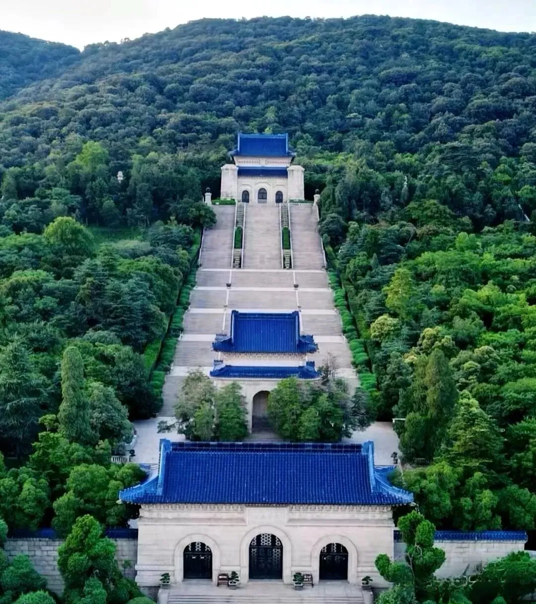 中山陵整个建筑群依山势而建,由南往北沿中轴线逐渐升高,主要建筑有牌坊、墓道、陵门、石阶、碑亭、祭堂和墓室等,排列在一条中轴线上,体现了中国传统建筑的风格。从空中往下看,像一座平卧在绿绒毯上的“自由钟”,寓含“唤起民众,以建民国”之意。