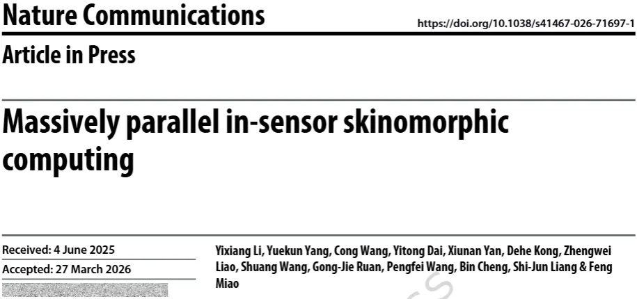 近日,南京大学缪峰教授、梁世军教授联合团队在国际顶级期刊《Nature Communications》发表题为 “Massively parallel in-sensor skinomorphic computing” 的研究论文,提出了一种全新的大规模并行感内类皮肤计算方案,在全模拟域实现了触觉信息的同步传感与并行处理,突破了传统触觉传感体系的性能瓶颈,为智能机器人、可穿戴电子设备的下一代触觉感知系统发展开辟了全新路径。1. 传统触觉架构遇核心瓶颈,生物启发构建全新计算范式