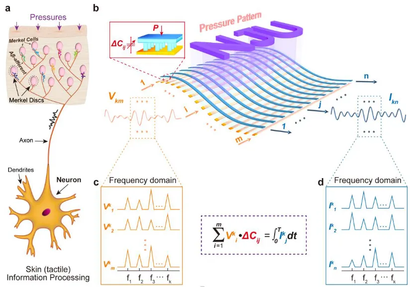 随着柔性可穿戴技术与边缘智能的快速发展,实时、高通量的触觉信息感知与处理成为智能机器人、人机交互等领域的核心需求。然而传统触觉传感方案中,传感器与处理器在物理上相互分离,触觉数据需经串行采集、模数转换后再传输至后端处理器分析,海量触觉数据的处理会产生巨大的能耗与延迟,成为制约类皮肤电子技术发展的核心障碍,尤其难以适配大面阵、高吞吐量的触觉感知任务。受人体皮肤触觉感知机制启发,团队开展了本次突破性研究。人体皮肤中的 Merkel 盘作为核心机械感受器,可将压力刺激编码为生物电信号,并通过神经元实现大规模并行的信息处理,让人体实现实时的外界压力感知。借鉴这一生物机制,团队提出了基于频分复用(FDM)技术的大规模并行感内类皮肤计算方案,利用连续时间模拟信号的多频率特性,在传感器内部直接实现触觉信息的并行传感与处理,从底层架构上颠覆了传统触觉系统的工作模式。2. 高可靠柔性传感阵列制备,硬件架构实现可扩展性突破