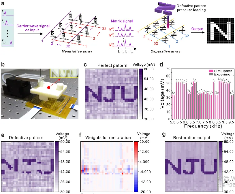 为实现上述计算方案的硬件落地,团队制备了一款 32×32 规模的柔性电容式压力传感器阵列,该阵列采用三明治堆叠结构,以聚酰亚胺(PI)为基底,金(Au)为底电极,带有柱状微结构的聚二甲基硅氧烷(PDMS)为介电层,导电聚合物 PEDOT:PSS 为顶电极,最终完成 PI 封装。测试结果显示,该传感器阵列有效压力响应范围覆盖 0.155 kPa 至 32.875 kPa,可精准检测从轻触到重压的全范围压力刺激,在 0-5 MHz 的宽频率范围内均能保持稳定的传感性能。该 32×32 阵列包含 1024 个传感单元,统计测试显示其电容响应率均值达 19.31%,标准差仅 2.38%,展现出极高的器件均匀性;在长达 4000 秒的循环加压测试中,器件性能无明显衰减,具备优异的长期耐久性。在此基础上,团队将柔性传感阵列与 1T1R(一晶体管一忆阻器)交叉阵列级联,构建了核心硬件系统。相较于传统架构实现全像素并行读取需 N² 个端口的设计,该方案针对 N×N 像素阵列仅需 2N 个端口,大幅降低了大规模阵列的布线与布局复杂度,阵列规模越大,其可扩展性优势越显著。3. 缺损图案并行修复,纹理特征提取实现数据高效压缩