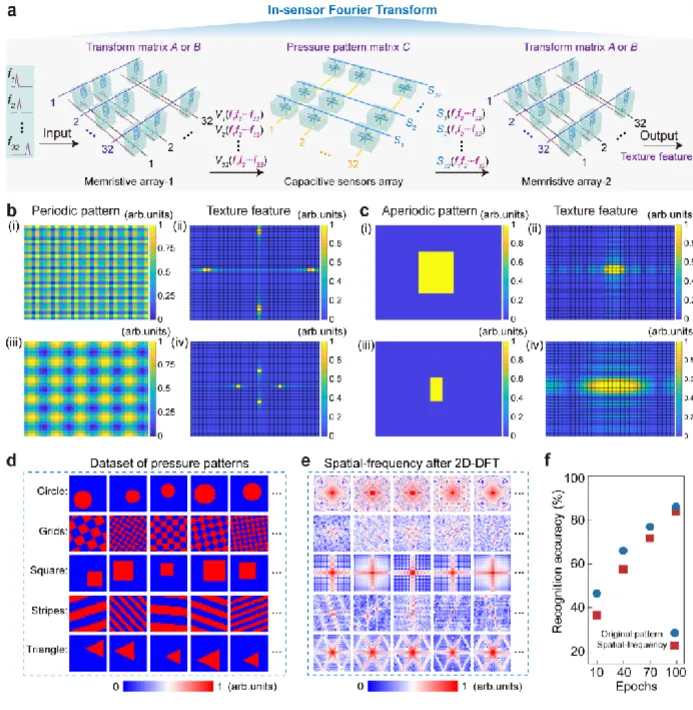 基于搭建的硬件系统,团队完成了多项核心功能的实验验证。在并行感知与模式修复实验中,团队通过 3D 打印的 “NJU” 浮雕图案向传感阵列加载压力,当忆阻器阵列配置为单位矩阵时,系统可精准捕获完整的 “NJU” 压力图案,实验结果与仿真频谱数据高度吻合;而当加载存在缺损的 “NJU” 图案时,只需为忆阻器阵列配置对应的修复权重矩阵,系统即可在传感的同时完成缺损图案的并行重建与修复,这一能力是此前已报道的柔性应变 / 压力传感技术无法实现的。为进一步挖掘系统的复杂信息处理能力,团队将传感阵列与两个 1T1R 忆阻器阵列组网,通过硬件化的二维离散傅里叶变换,实现了复杂压力图案纹理特征的直接并行提取。实验结果显示,针对周期性压力图案,系统输出的纹理特征在频域平面呈现离散分布,非周期性图案则呈现准连续分布,完全符合傅里叶变换理论;同时提取后的纹理特征相较原始压力图案数据量显著压缩,基于该频域特征完成的 5 类图案识别任务,识别准确率与基于原始图像的结果相当,充分验证了该技术在边缘智能场景中的实用性。4. 全模拟域并行计算落地,多领域应用前景广阔