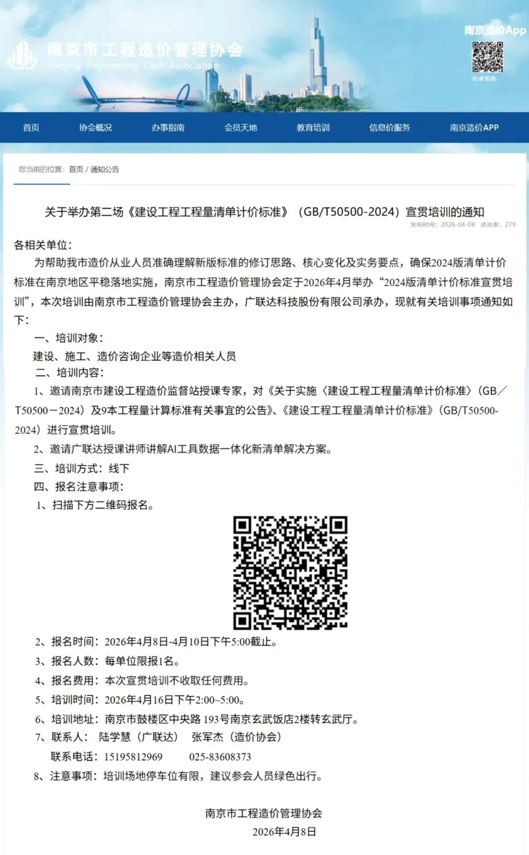 4月16日,由南京市工程造价管理协会主办、广联达科技股份有限公司承办的《建设工程工程量清单计价标准》(GB/T50500-2024)宣贯培训会即将在南京举办!本次培训会特邀南京市建设工程造价监督站授课专家亲临现场,权威解读。