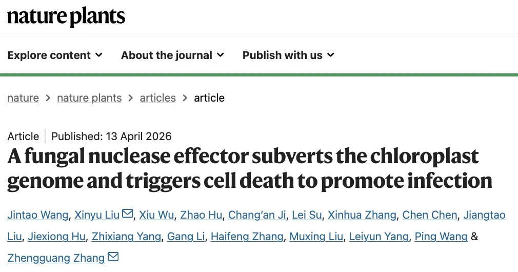 2026年4月13日,Nature Plants杂志在线发表了来自南京农业大学张正光教授团队题为“A fungal nuclease effector subverts the chloroplast genome and triggers cell death to promote infection”的研究论文。该研究揭示了稻瘟病菌通过分泌一种新型坏死性效应子MoNee6,作为核酸酶直接降解水稻叶绿体DNA,从而诱导宿主细胞死亡并推动病菌从活体营养向死体营养转换的关键分子机制。这一发现首次阐明了病原菌效应子直接攻击叶绿体基因组以操控宿主细胞命运的全新策略。