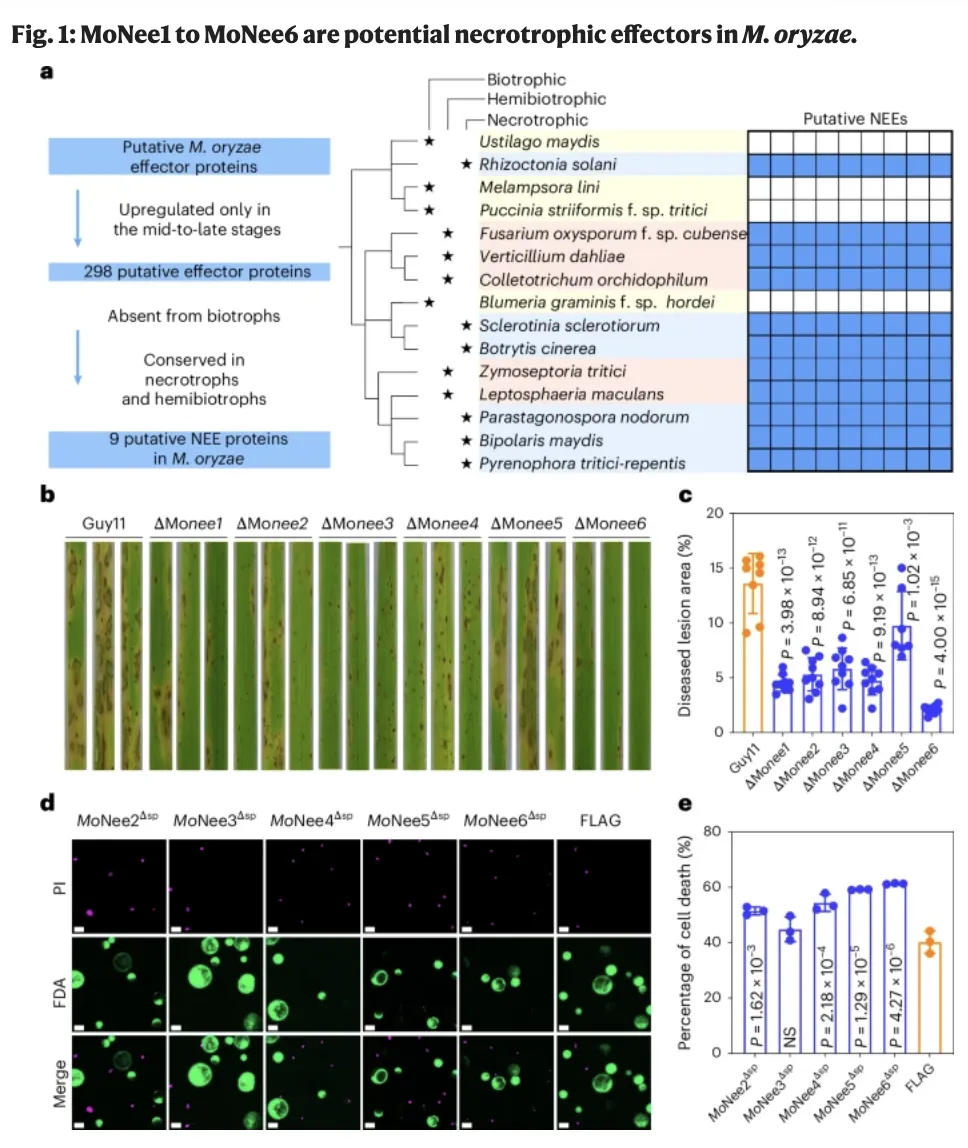 该研究首先通过转录组测序结合跨物种效应子保守性分析,从298个在侵染中后期上调表达的候选效应子中,系统筛选并鉴定出6个坏死性效应子(MoNee1–MoNee6),其中MoNee6对稻瘟病菌致病力的贡献最为显著;