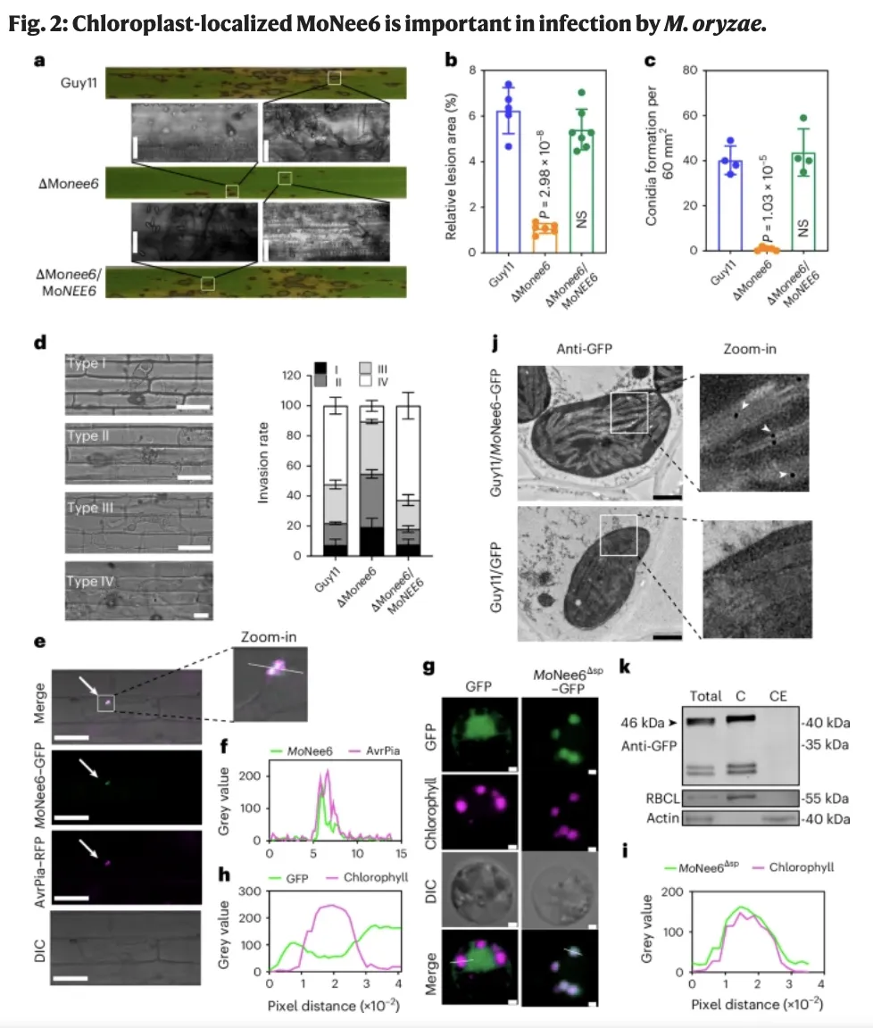 稻瘟病菌引起的稻瘟病是全球水稻生产上最具破坏性的病害之一。作为一种半活体营养真菌,稻瘟病菌在侵染初期依赖活体营养策略在宿主活细胞中生长,随后转变为死体营养策略,主动诱导宿主细胞死亡以获取养分并完成产孢和传播。这种营养方式的转换是病害发生与流行的核心环节,但其背后的分子调控机制长期未被阐明。以往研究表明,坏死性病原菌常分泌坏死性效应子(NEEs)来操控宿主免疫,但在稻瘟病菌中此类效应子一直未被鉴定。此外,叶绿体作为植物光合作用和免疫信号的中心,常成为病原菌攻击的目标,然而效应子如何破坏叶绿体功能以促进死体营养转换仍有待深入探究。