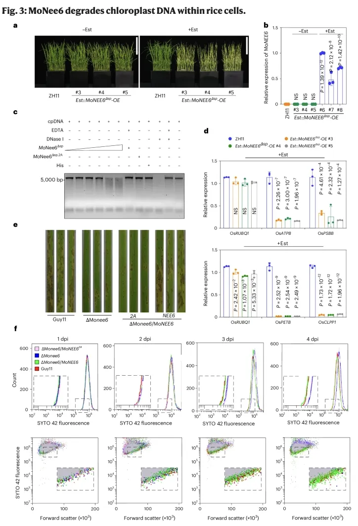 进一步通过共定位分析、免疫金标记和亚细胞分离实验发现,MoNee6能够被分泌进入水稻叶绿体,并特异性地定位于叶绿体基质中;然后通过核酸酶活性测定、叶绿体DNA染色及转录水平检测等实验证实,MoNee6具有核酸酶功能,可直接降解叶绿体DNA,并显著抑制叶绿体编码基因(如OsATPB、OsPSBB等)的转录,从而诱导不可逆的叶绿体功能障碍和宿主细胞死亡;