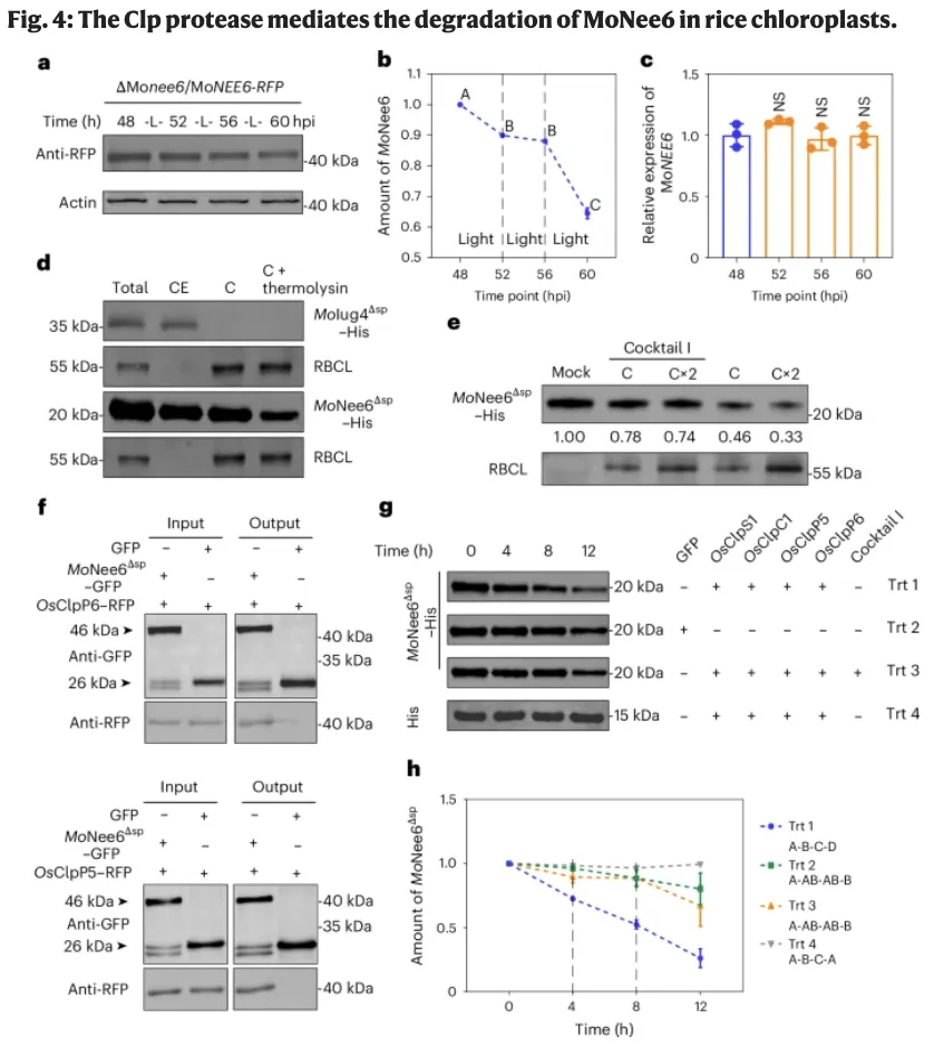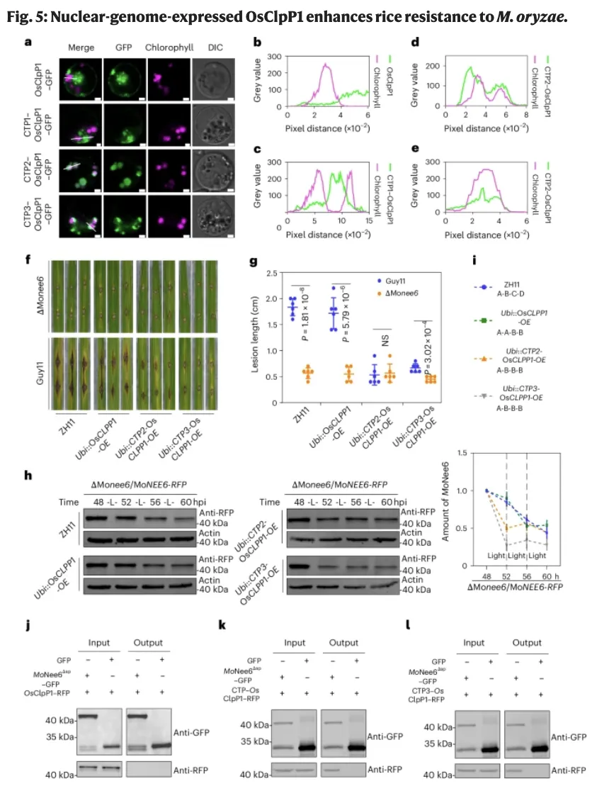 最终,该研究通过将核基因编码的OsClpP1与叶绿体转运肽(CTP)融合,实现了OsClpP1在叶绿体中的异位表达,恢复了Clp蛋白酶复合物的活性,加速了MoNee6的降解,从而显著增强了水稻对稻瘟病的抗性。