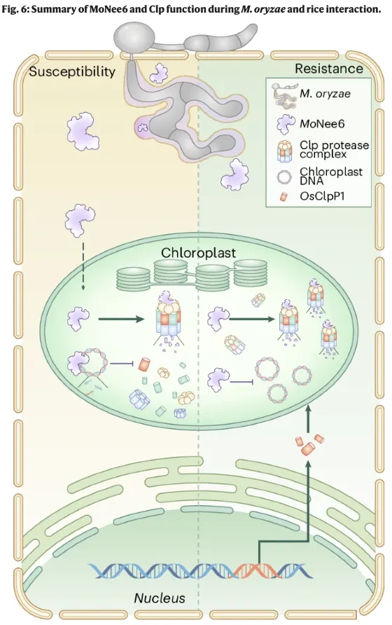 与此同时,研究发现水稻叶绿体中的酪蛋白裂解酶(Clp)蛋白酶复合物可部分降解MoNee6以减轻其毒性,但MoNee6介导的叶绿体DNA损伤会抑制叶绿体编码的OsCLPP1亚基表达,从而削弱Clp蛋白酶活性,使病菌得以成功侵染;