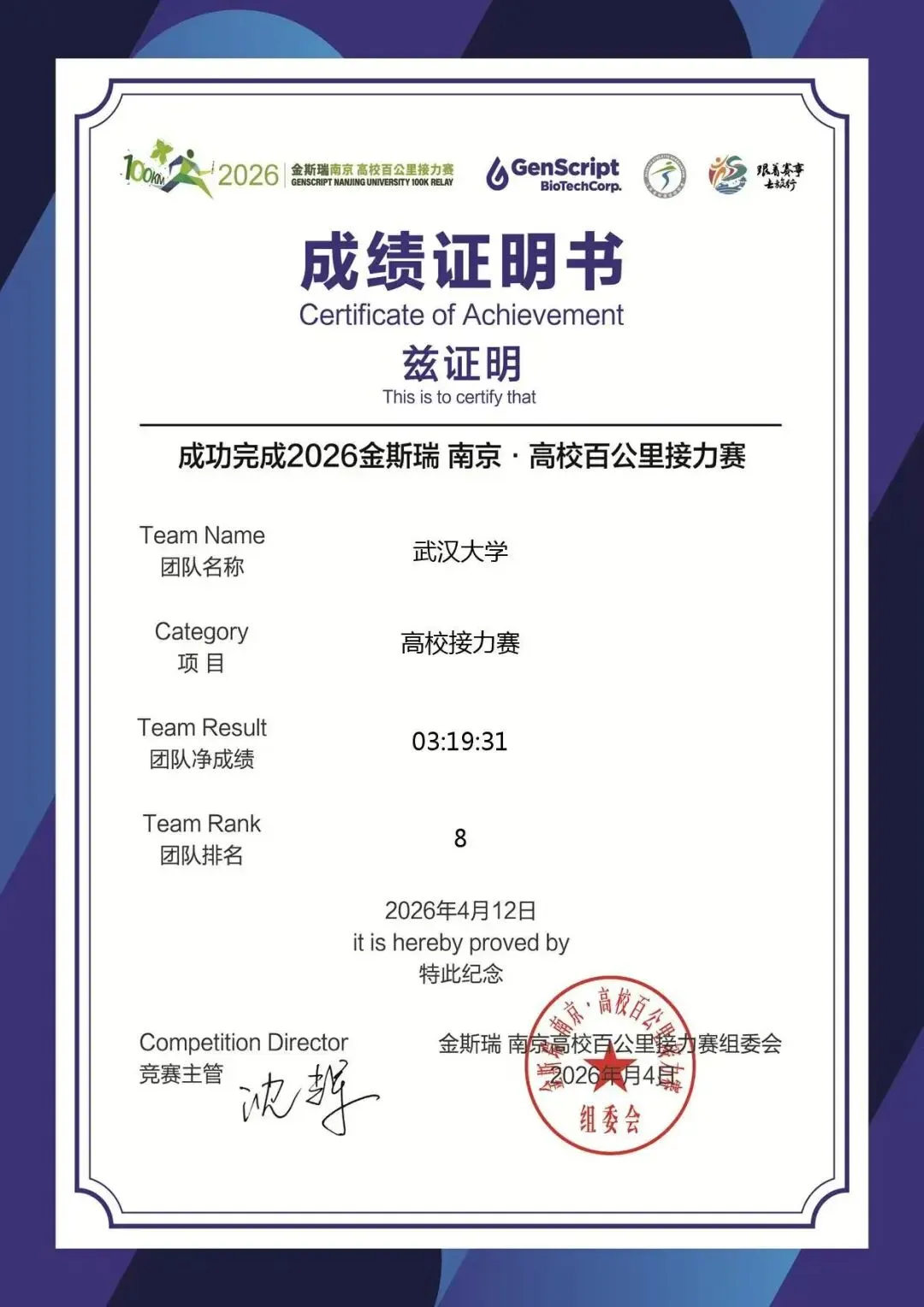 非常喜欢和大家一起出去比接力赛,赛前的欢乐,赛中的热血,赛后的放松,都是我每一个阶段的治愈神器。尤其最近强度拉满的两个月,过多地考虑未来、毕业与工作,让我忘了享受当下的幸福。感谢这次古都南京的风雨,接力赛场的竞技,以及珞珈战队支持与鼓励。跑起来就有风,风吹过后,留下的不止胜利,还有充斥内心的勇气与动力。