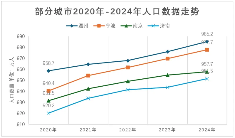 宁波2024年的常住人口是977万,而温州是985万,它们比南京都更接近千万大关,而且过去几年的人口增量也更多。从2021年到2024年,宁波人口增长了35万多,温州则增长了27万多。