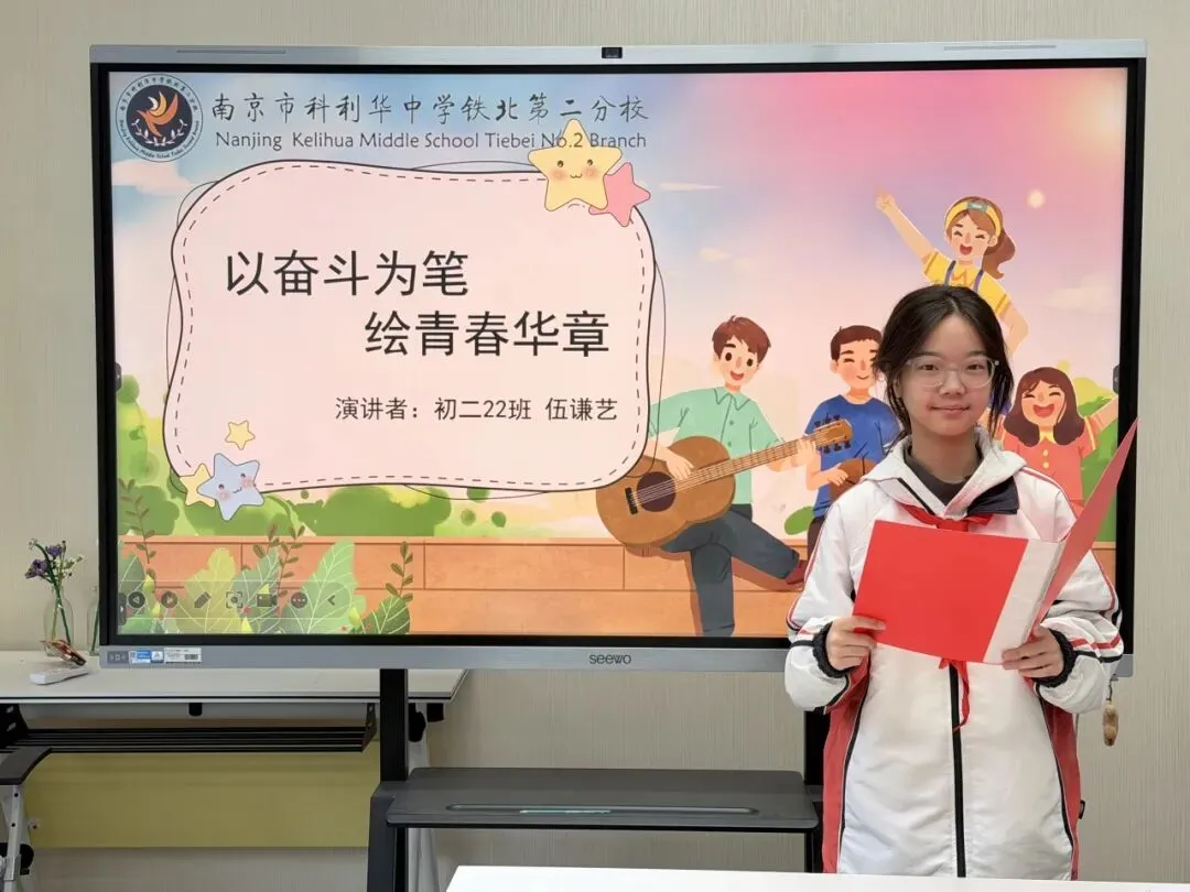 随后,初二22班的伍谦艺同学带来国旗下讲话《以奋斗为笔,绘青春华章》。她鼓励同学们在成长路上不惧挫折、不畏迷茫,以奋斗为底色,用坚持与拼搏追逐梦想,让青春在努力中绽放光彩。