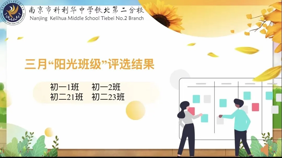 最后,主持人公布了三月“阳光班级”评比结果:初一1班、初一2班、初二21班、初二23班。以上班级凭借优秀的常规表现、整洁卫生与出色的班级文化建设成功当选。希望各班级以榜样为标杆,严守常规、团结向上,共同打造更文明、更温暖的校园。