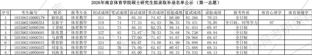 因我校学科教学(体育)专业上线和调剂的生源不足,按相关规定,经学校招生委员会决议,现将其剩余招生计划调至体育硕士(全日制)进行招生,根据考生总成绩由高到低进行补录工作。现将补录拟录取名单(第一志愿)予以公示,公示期为七个工作日,如有疑问请于公示期内向南京体育学院研究生工作处反映。对弄虚作假者,一经查实,按有关规定取消录取资格。联系电话:025—84755173。