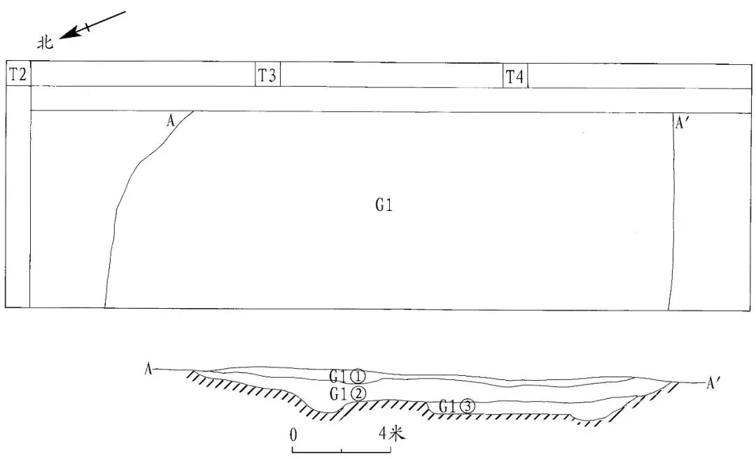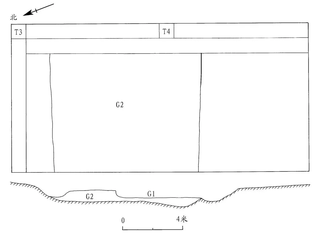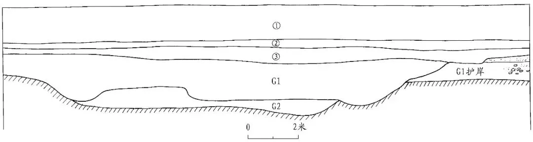 G2 位于发掘区中部,分布于 T3、T4 两个探方。开口于③层下,上部被 G1 叠压,打破生土层。东西走向,方 向 约 282° 。平 面 呈 长 条形,剖面呈上宽下窄的倒梯形。发掘部分长 8、宽 10.5、残 深 3.1~4、最 厚 处 0.7 米(图五)。沟内填土呈黄褐色,土质较为致密,含碎砖瓦片及少量贝壳。