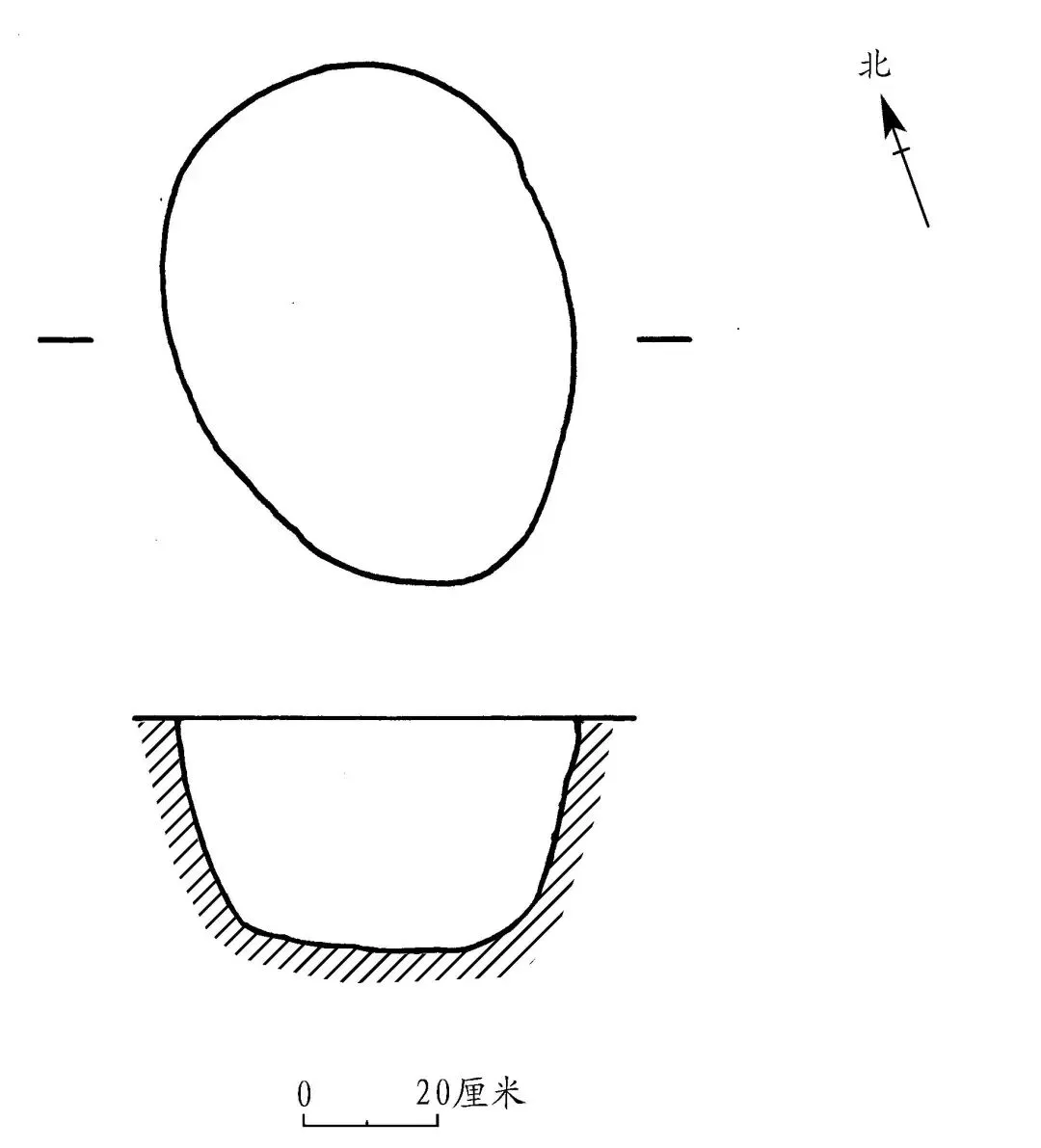 H1位于 T5 西北角。开口于③层下,打破G1南侧护岸。平面形状呈椭圆形,斜直壁,底近平。直径0.55~0.8、深 0.35 米(图六)。坑内填土灰色,土质松软,含木炭颗粒。