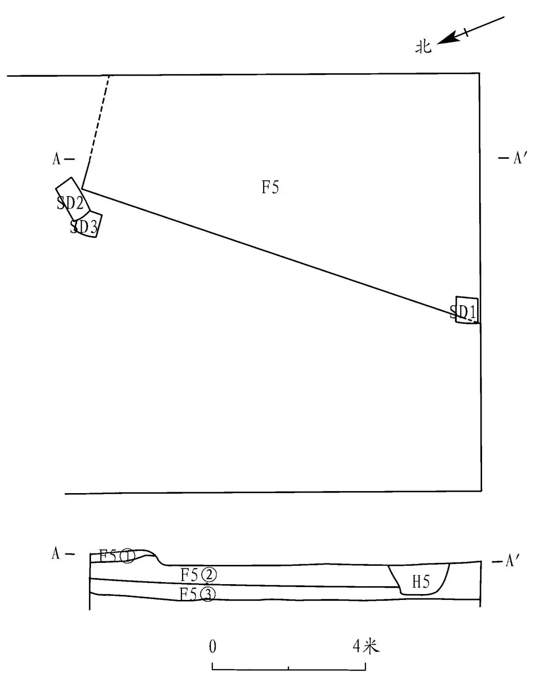 房址 5 处。编号 F1—F5,因受发掘范围限制,均未揭露完整。其中 F1—F4,均开口于②层下,营建方式一致,部分房址出土有琉璃板瓦等,应为明清时期遗迹。F5,开口于③层下,结合出土瓷器判断,应为宋代。