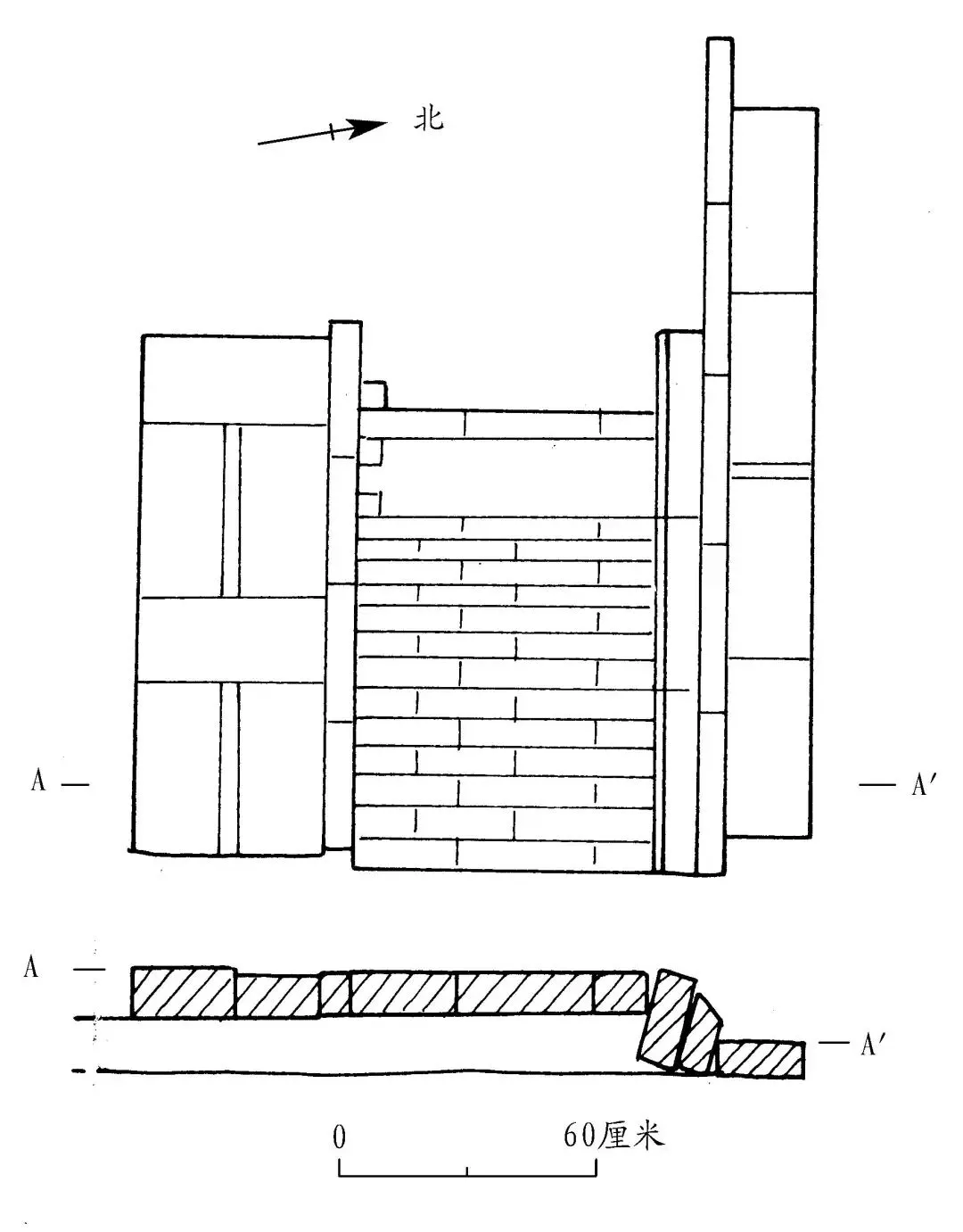 F1 位于 T1 与 T2 东部。距地表 1.3 米,开口于②层下,打破③层及生土,方向 10°。平面近长方形(因受发掘面积限制,揭露不全,部分已伸出发掘区外),东西发掘长 6.1、南北长 11.1 米(图七)。根据剖面来看,该建筑基址由黄褐色土与砖瓦相间夯筑而成,包含零星瓷片。残存六层,每层厚0.1~0.2米。