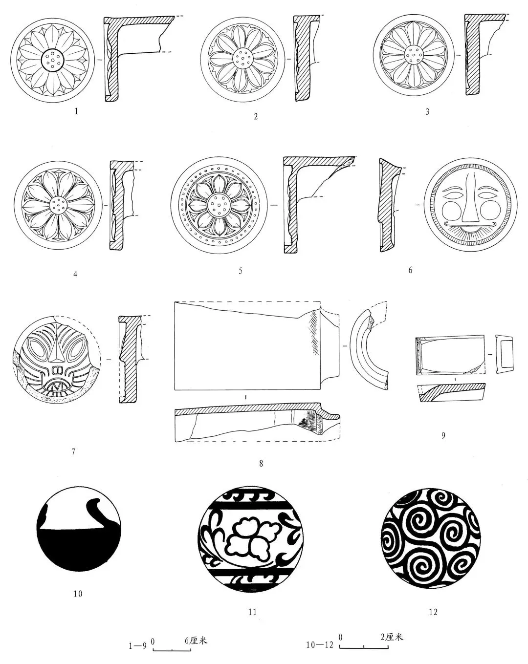 1—4. 莲花纹瓦当(T2③:1、T5③:2、T2G1②:3、T3G2:10) 5. 联珠莲花纹瓦当(T3G1②:20) 6. 人面纹瓦当(T3G2:4)
