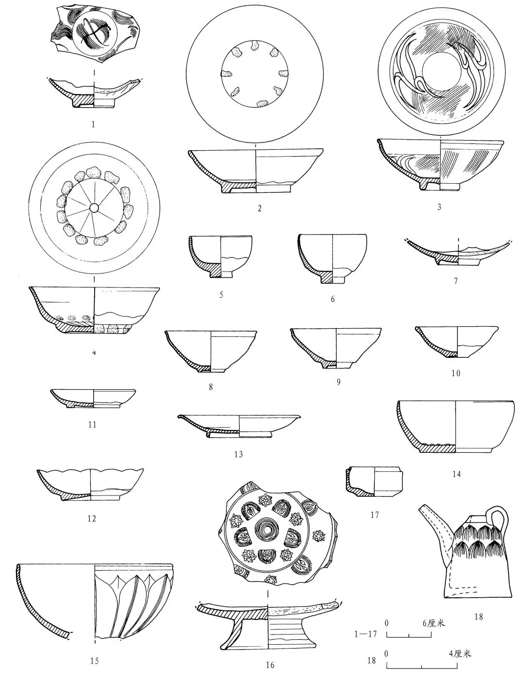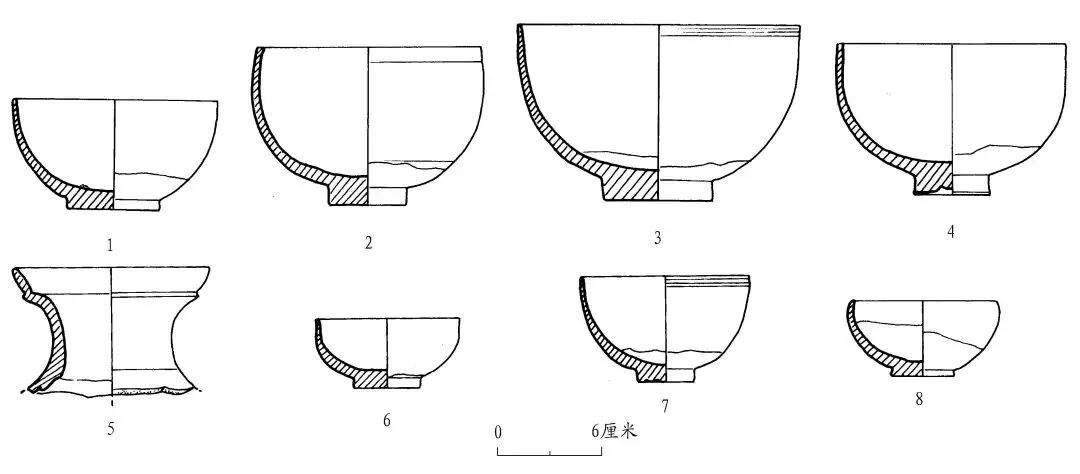 青釉碗 6 件。T3②︰3,仅存下腹部及圈足。灰褐色胎,青釉泛黄。内壁满釉,外壁施釉近足端。内底刻圆,内壁满刻篦划纹。底径 5.6、残高4厘米(图一一︰1)。T5③︰8,腹部残,可修复。敞口,圆唇,斜弧腹,圈足。灰黄胎,青釉泛黄,亚光。内底 刻 圆 ,内 底 心 有 8 处 松 子 状 叠 烧 痕 迹 。口 径18.4、底径 9.4、高 5.8 厘米(图一一︰2)。T3G1①︰3,口沿残,可修复。敞口,斜弧腹,圈足。青灰胎,青釉偏黄,釉面亚光,局部可见积釉。内壁满釉,外壁施釉至下腹部。内壁刻划篦划纹为地的花卉纹,外壁为折扇纹。口径 17.2、底径 5.4、高 6.8 厘米(图一一︰3)。T3G1③︰1,口沿残,可修复。敞口,斜弧腹,圈足。褐色胎,青釉泛黄,器身流釉现象严重,外壁施釉至下腹部。内底心可见放射状纹样,内底有 12 处泥点状支烧痕。口径 17.6、底径 8.4 、高 6.2 厘米(图 一一 ︰4)。 T3G2︰1,器身残,可修复。直口,上腹竖直,下腹圆曲,饼足。灰胎。青釉泛黄,釉面光亮,可见大量开片。内壁满釉,外壁施釉至下腹部。口径8.4、底径 3.2、高 5.6 厘米(图一一 ︰5)。T3G2︰3,器身残,可修复。直口,上腹竖直,下腹圆曲,饼足。灰黄胎。青釉泛黄,釉面光亮,局部有流釉现象。内壁满釉,外壁施釉至下腹部。口径 9.2、底径 3.2 、高 6.6 厘米(图一一︰6)。