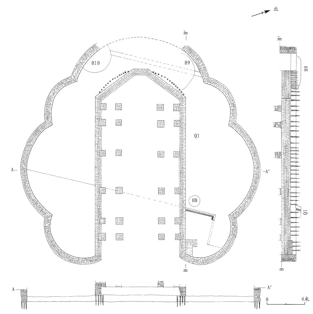 Q1 位于李公祠工地北部发掘区荷花池内,距地表 2.1 米,被荷花池中部的水榭建筑所叠压,向下叠压在黄白色沙性生土上。Q1 由东侧砖砌包墙、墙体及西侧沟槽组成。东侧砖砌包墙与西侧沟槽基本平行,其内为墙体,宽 14.3 米。由于后期破坏扰乱严重,墙体残留较少,仅在紧贴砖墙西侧的区域保存小面积的夯土,呈灰黄色,土质硬结,内含较多灰土块及碳粒。包砖西侧约45 厘米处有一宋代灰坑 H8打破夯土墙体及生土。