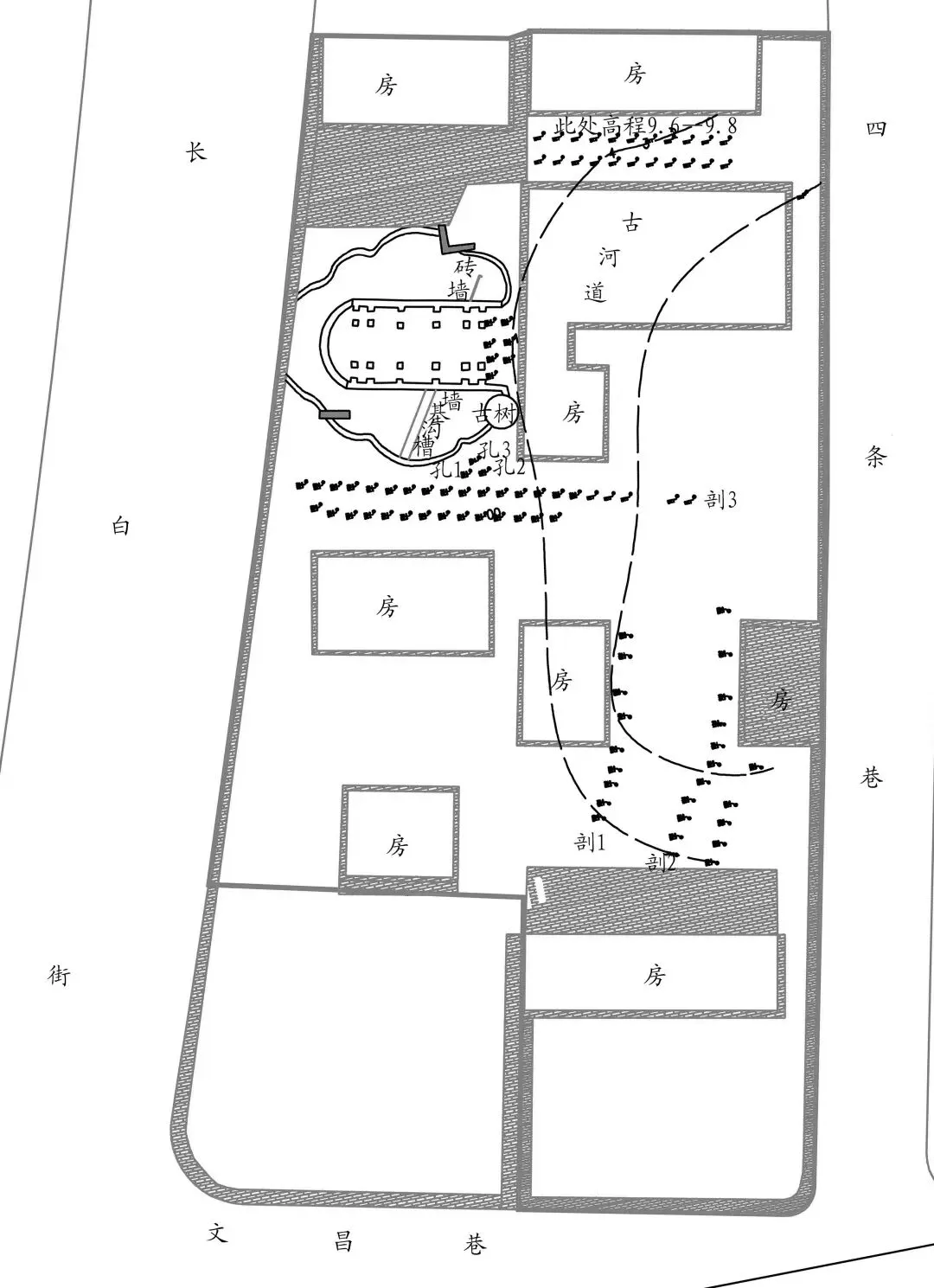 本次发掘过程中,在李公祠地块未发掘区域进行了勘探,具体布孔地点有荷花池的东侧和南侧、李公祠东路第四和第五进建筑之间、已无存的第二和第三进建筑区域及其间空地。发现一处大致南北向河道,河道北部折向东北,最西侧距Q1 东壁包砖不足 2 米,河道南侧折向东南,在南北约 100 米的范围内,河道呈现出口朝东的 U 形曲折。