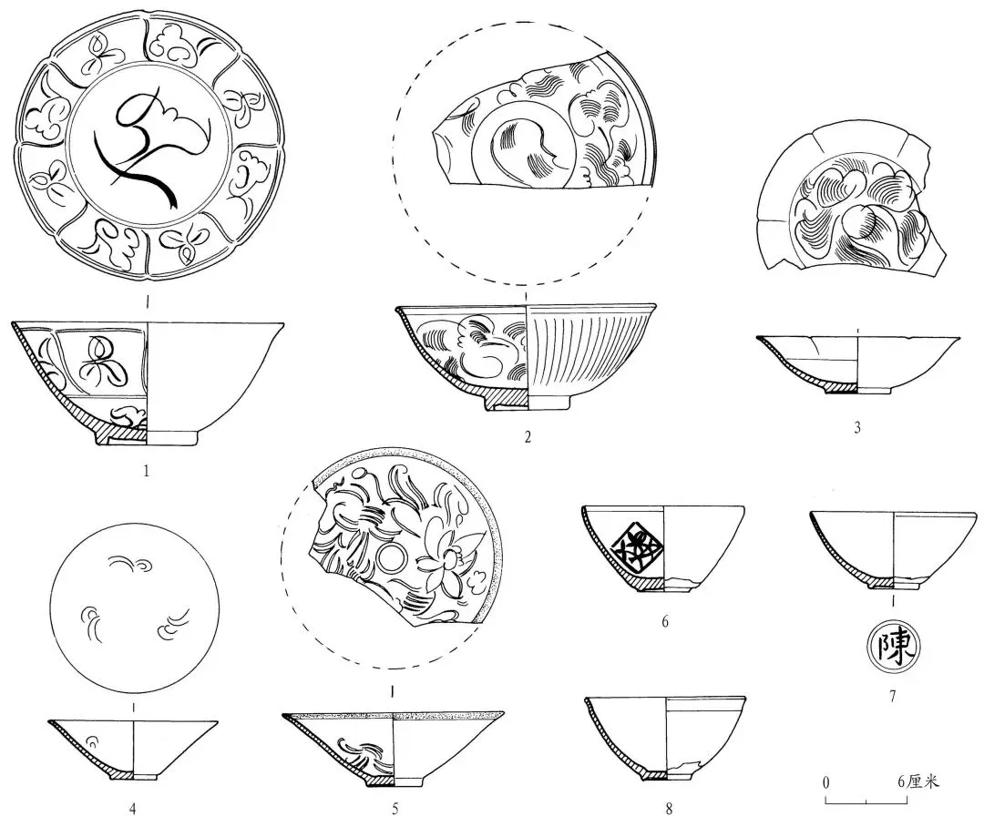 青白瓷碗 3 件。H8︰2,残。敞口,葵口,尖唇,斜直腹,饼足,挖足极浅。灰白胎,青白釉,釉面泛黄,外底部露胎无釉。内壁花口至中腹部有六条等分出筋,内壁腹部有大刻圆,圆内饰卷云纹。口径 14.4、底径 4.6、高 4 厘米(图一六︰3)。H8︰3,口腹部略残。敞口,斜直腹,饼足。灰白胎,胎质细腻,较薄。青白釉,釉面可见大量开片,外足无釉。内壁腹部饰三组卷草纹。口径 12、底径 3.2、高4.2厘米(图一六︰4)。H8︰7,尖唇,敞口,斜直腹,饼足。灰白胎,青白釉,釉面光亮,局部有开片。内壁满饰花卉纹。内底饰小刻圆。口沿原镶饰银扣,已脱落。口径 15.6、底径 3.9、高 5.2 厘米(图一六︰5)。
