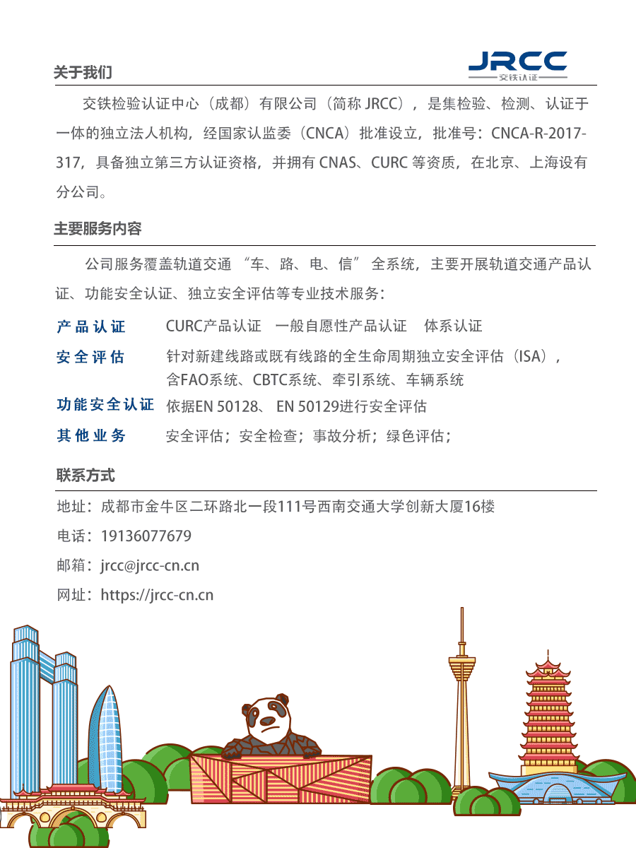 交铁检验认证中心(成都)有限公司(简称JRCC)是在“质量提升行动”、“一带一路”、“高铁走出去”国家战略的时代背景下,由西南交通大学着力打造的集轨道交通计量标准、检验检测、认证评估的一体化高技术服务平台。JRCC依托西南交大铁路轨道交通百年发展的行业学科专业的综合优势及国际一流的技术团队,以轨道交通国家质量基础(NQI)实验室作为检验认证的技术支撑资源,成为轨道交通行业在认证认可、检验检测、安全评估领域的高端技术服务机构。